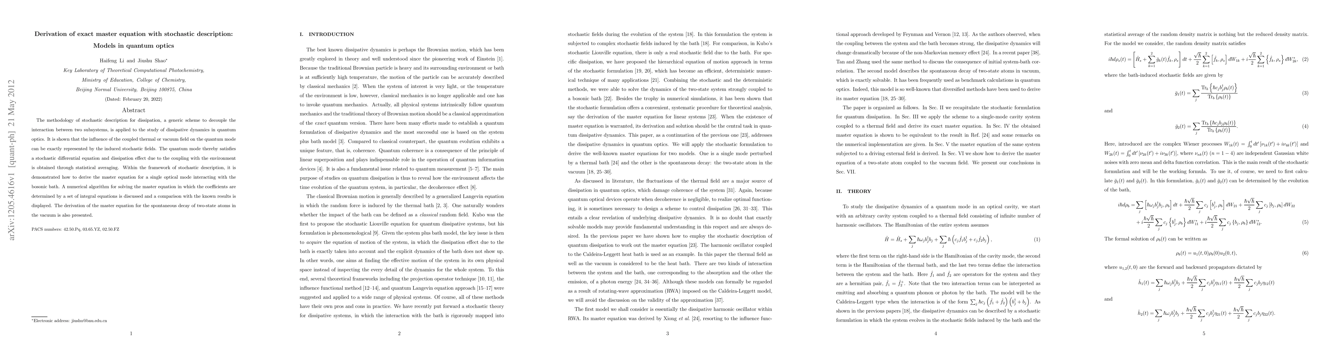 This paper derives an exact master equation for dissipative dynamics in quantum optics using a stochastic description. It shows the influence of thermal or vacuum fields on quantum modes through induced stochastic fields, leading to a stochastic differential equation that captures the environment's coupling effect via statistical averaging.