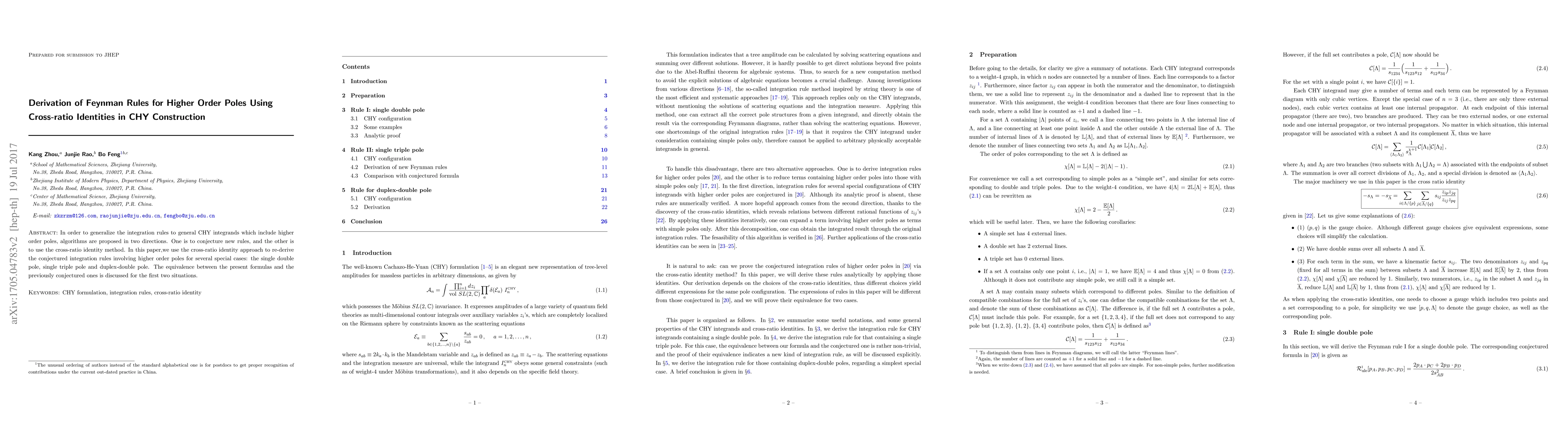 This paper proposes using cross-ratio identities within the CHY construction to derive Feynman rules for higher order poles, specifically for single double, single triple, and duplex-double poles. It demonstrates the equivalence of the newly derived formulas with previously conjectured rules for the first two cases.