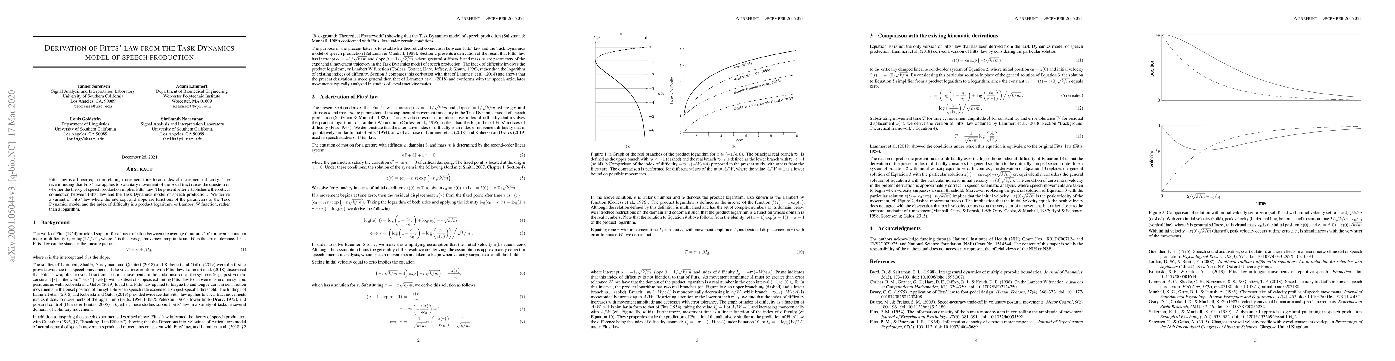 This paper establishes a theoretical link between Fitts' law and the Task Dynamics model of speech production, deriving a variant of Fitts' law with parameters dependent on the Task Dynamics model, and using a Lambert W function instead of a logarithm for the index of difficulty.