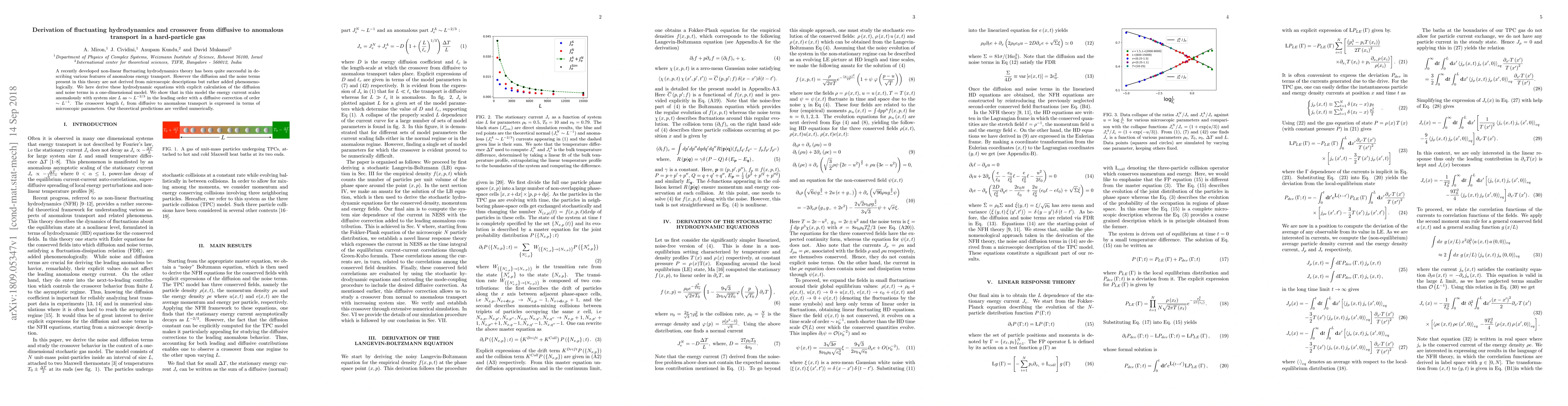 This paper derives non-linear fluctuating hydrodynamics equations for a one-dimensional hard-particle gas, explicitly calculating diffusion and noise terms from microscopic models. It shows anomalous energy transport scaling as $\sim L^{-2/3}$ with a diffusive correction and identifies a crossover length for transition from diffusive to anomalous transport, verified numerically.