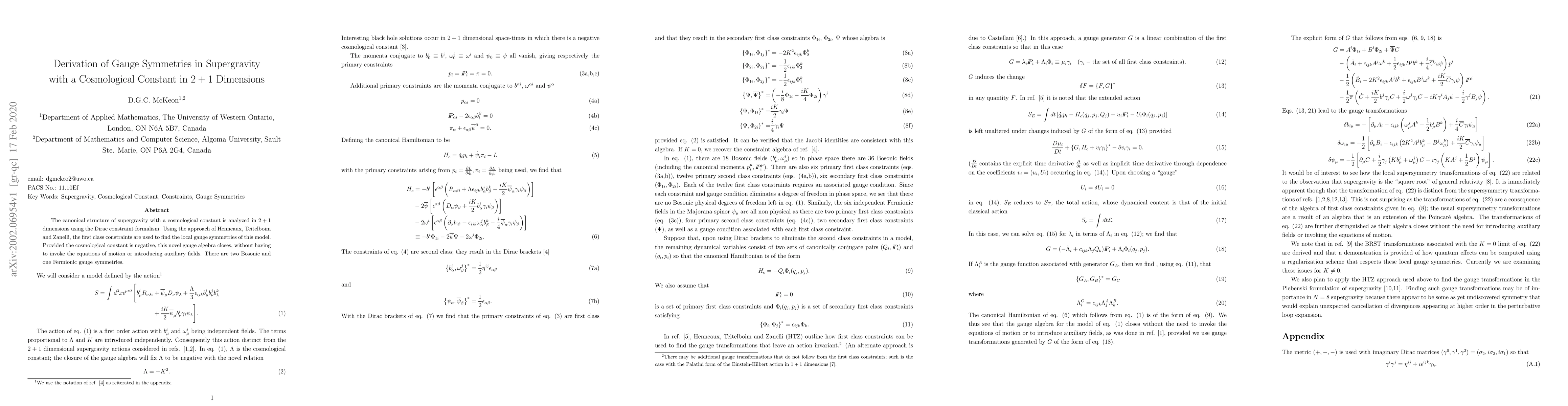 The canonical structure of supergravity with a cosmological constant is analyzed in 2 + 1 dimensions using the Dirac constraint formalism. The first class constraints are used to find two Bosonic and one Fermionic gauge symmetries that satisfy a superalgebra. Provided the cosmological constant is negative, this novel algebra closes, without having to invoke the equations of motion or introducing auxiliary fields.