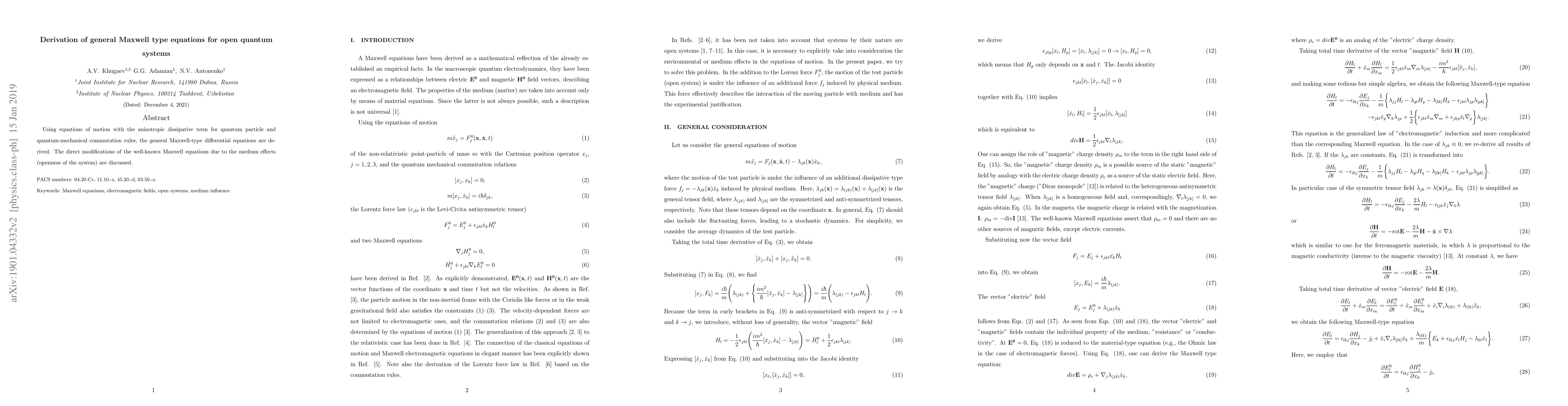 Using equations of motion with the anisotropic dissipative term for quantum particle and quantum-mechanical commutation rules, the general Maxwell-type differential equations are derived. The direct modifications of the well-known Maxwell equations due to the medium effects (openness of the system) are discussed.