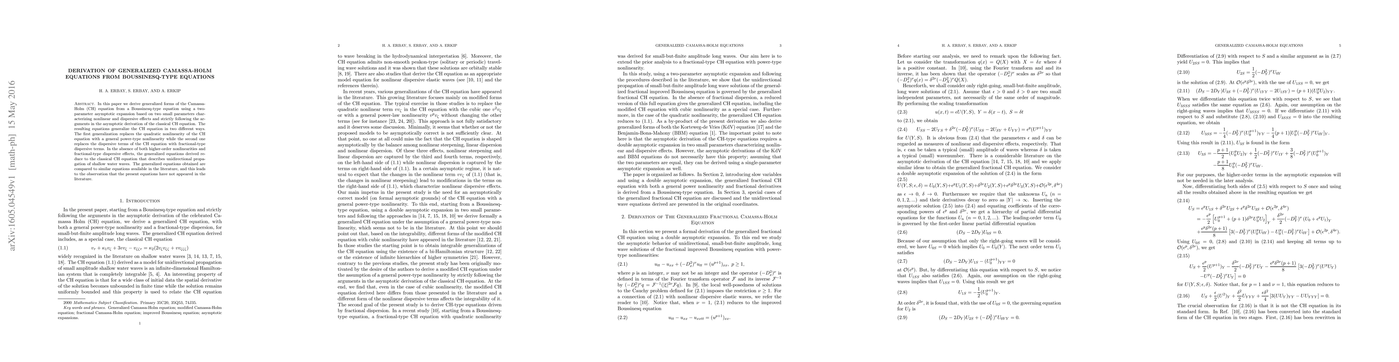 This paper derives generalized forms of the Camassa-Holm equation from a Boussinesq-type equation using a two-parameter asymptotic expansion. The generalizations include power-type nonlinearities and fractional-type dispersive terms, differing from the classical CH equation.