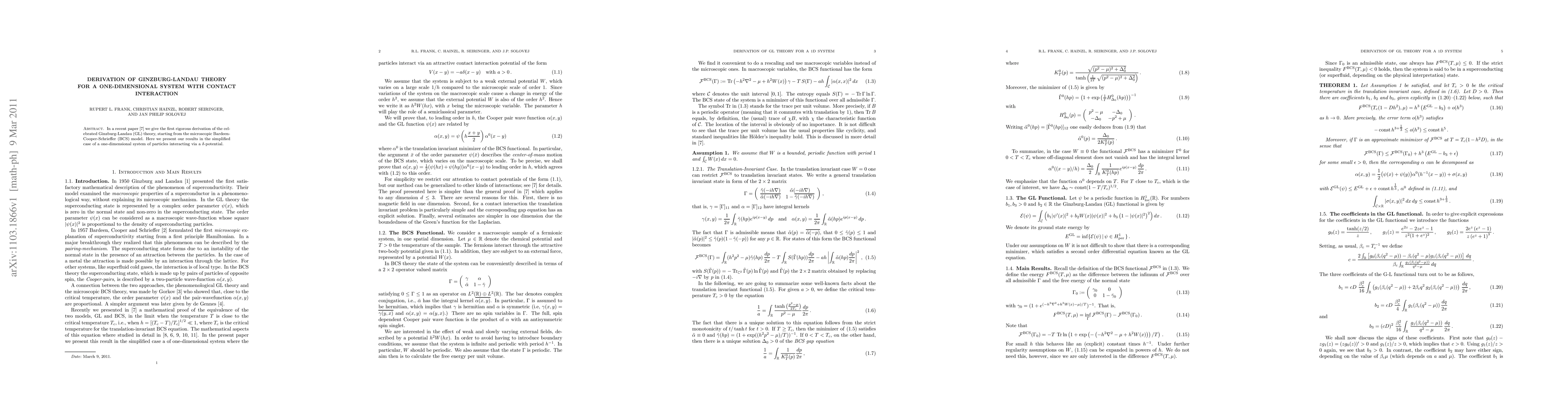 In a recent paper we give the first rigorous derivation of the celebrated Ginzburg-Landau (GL) theory, starting from the microscopic Bardeen-Cooper-Schrieffer (BCS) model. Here we present our results in the simplified case of a one-dimensional system of particles interacting via a delta-potential.
