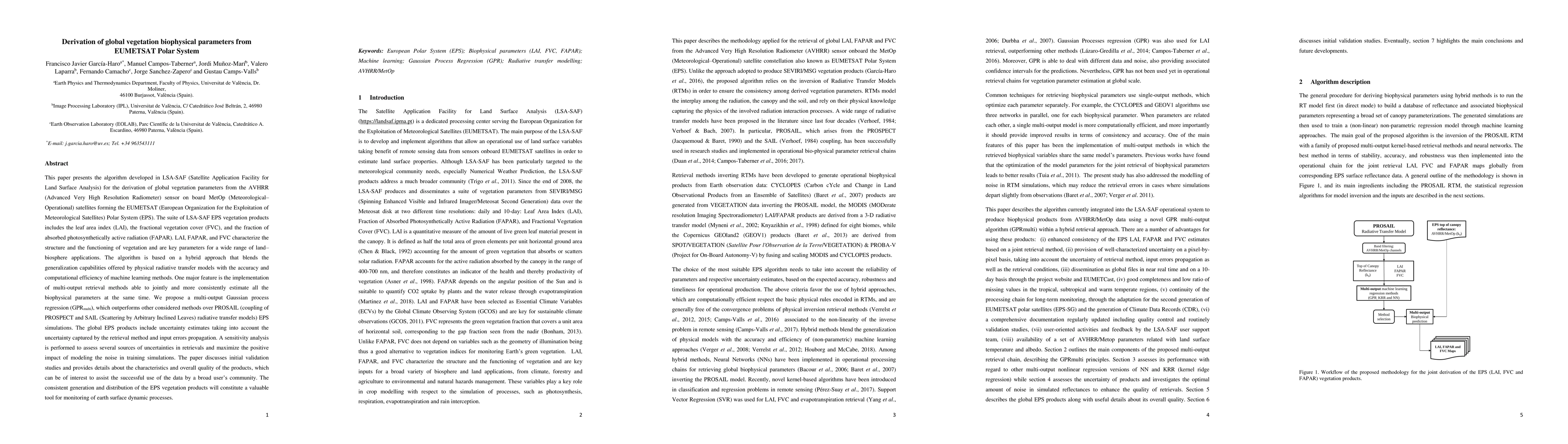 This paper presents the algorithm developed in LSA-SAF (Satellite Application Facility for Land Surface Analysis) for the derivation of global vegetation parameters from the AVHRR (Advanced Very High-Resolution Radiometer) sensor onboard MetOp (Meteorological-Operational) satellites forming the EUMETSAT (European Organization for the Exploitation of Meteorological Satellites) Polar System (EPS). The suite of LSA-SAF EPS vegetation products includes the leaf area index (LAI), the fractional vegetation cover (FVC), and the fraction of absorbed photosynthetically active radiation (FAPAR). LAI, FAPAR, and FVC characterize the structure and the functioning of vegetation and are key parameters for a wide range of land-biosphere applications. The algorithm is based on a hybrid approach that blends the generalization capabilities offered by physical radiative transfer models with the accuracy and computational efficiency of machine learning methods. One major feature is the implementation of multi-output retrieval methods able to jointly and more consistently estimate all the biophysical parameters at the same time. We propose a multi-output Gaussian process regression (GPRmulti), which outperforms other considered methods over PROSAIL (coupling of PROSPECT and SAIL (Scattering by Arbitrary Inclined Leaves) radiative transfer models) EPS simulations. The global EPS products include uncertainty estimates taking into account the uncertainty captured by the retrieval method and input error propagation. The consistent generation and distribution of the EPS vegetation products will constitute a valuable tool for monitoring of earth surface dynamic processes.