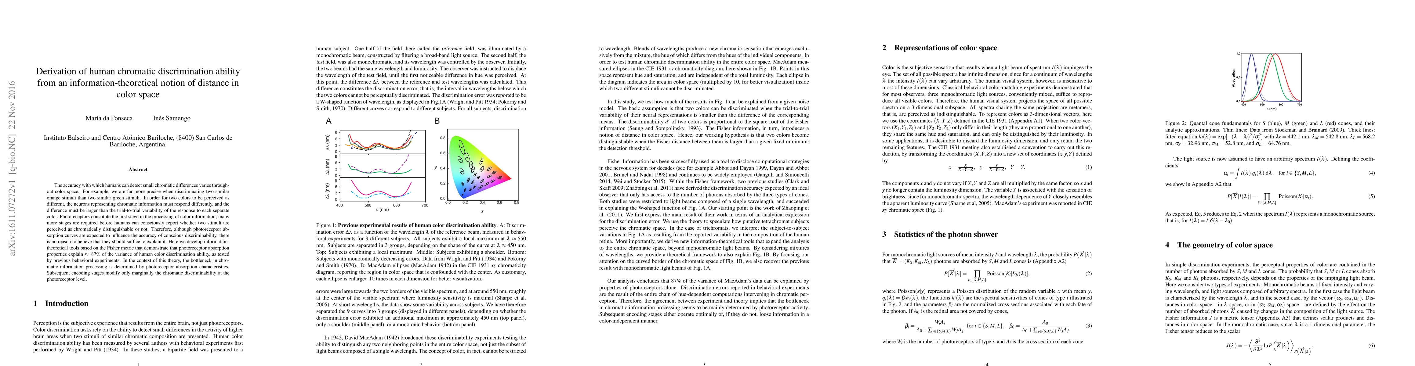 The accuracy with which humans can detect small chromatic differences varies throughout color space. For example, we are far more precise when discriminating two similar orange stimuli than two similar green stimuli. In order for two colors to be perceived as different, the neurons representing chromatic information must respond differently, and the difference must be larger than the trial-to-trial variability of the response to each separate color. Photoreceptors constitute the first stage in the processing of color information; many more stages are required before humans can consciously report whether two stimuli are perceived as chromatically distinguishable or not. Therefore, although photoreceptor absorption curves are expected to influence the accuracy of conscious discriminability, there is no reason to believe that they should suffice to explain it. Here we develop information-theoretical tools based on the Fisher metric that demonstrate that photoreceptor absorption properties explain ~87% of the variance of human color discrimination ability, as tested by previous behavioral experiments. In the context of this theory, the bottleneck in chromatic information processing is determined by photoreceptor absorption characteristics. Subsequent encoding stages modify only marginally the chromatic discriminability at the photoreceptor level.