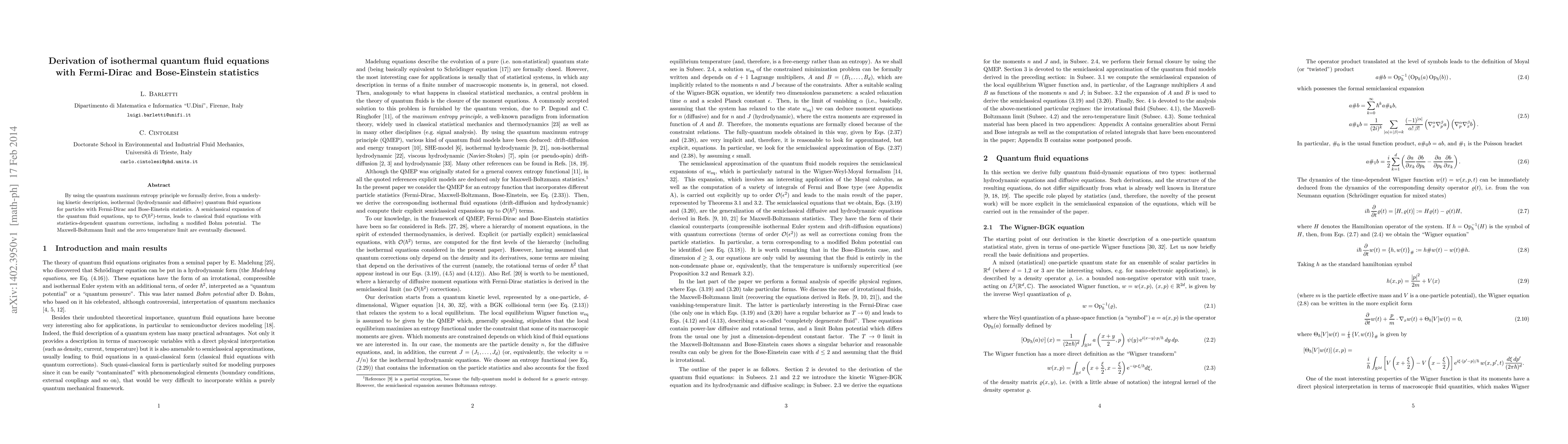 This paper derives isothermal quantum fluid equations for Fermi-Dirac and Bose-Einstein particles using the quantum maximum entropy principle, and discusses semiclassical expansions and limits, including quantum corrections and the modified Bohm potential.