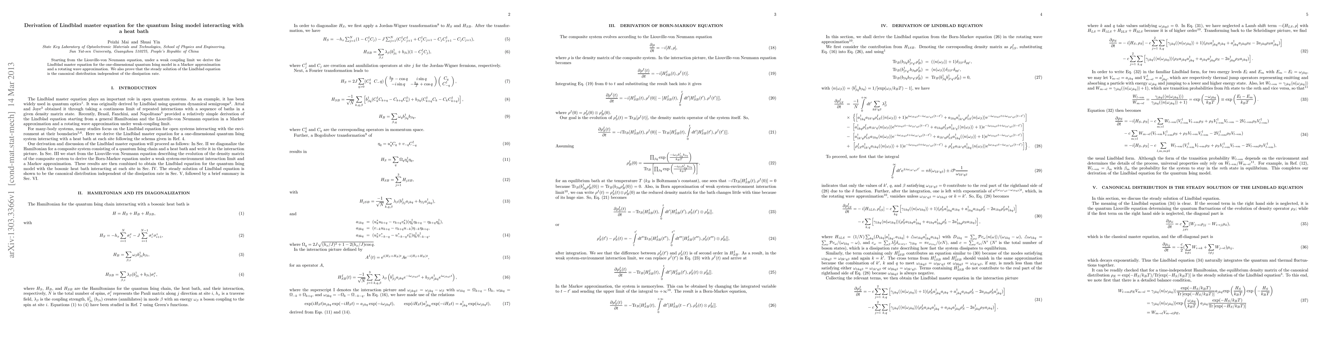 Starting from the Liouville-von Neumann equation, under a weak coupling limit we derive the Lindblad master equation for the one-dimensional quantum Ising model in a Markov approximation and a rotating wave approximation. We also prove that the steady solution of the Lindblad equation is the canonical distribution independent of the dissipation rate.