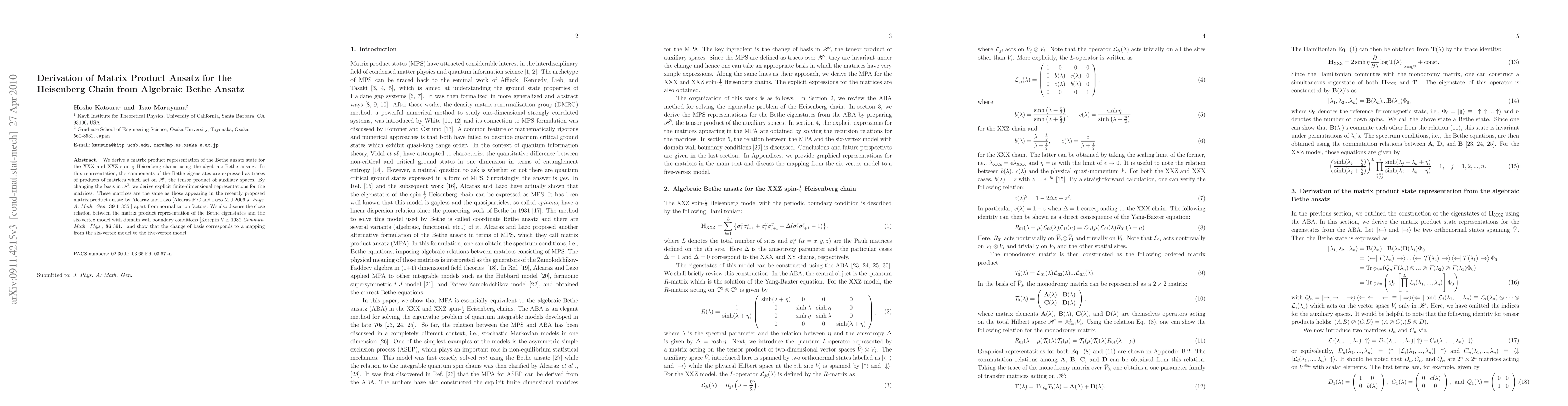 This paper derives a matrix product representation of the Bethe ansatz state for the Heisenberg chains using the algebraic Bethe ansatz, showing equivalence to the matrix product ansatz by Alcaraz and Lazo, and discusses the connection to the six-vertex model.