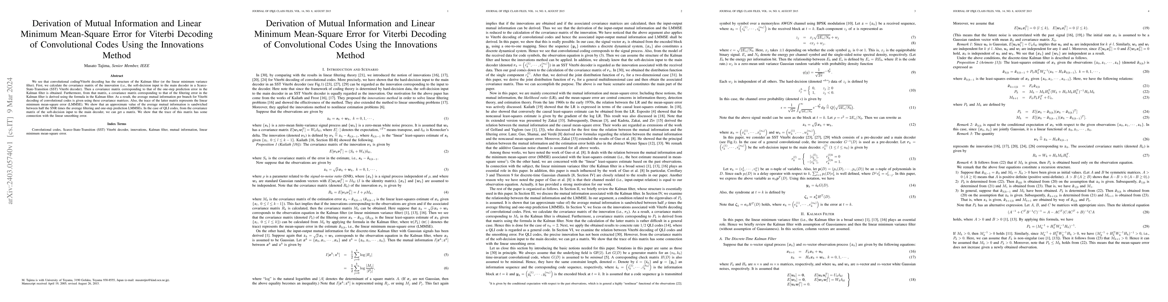 We see that convolutional coding/Viterbi decoding has the structure of the Kalman filter (or the linear minimum variance filter). First, we calculate the covariance matrix of the innovation (i.e., the soft-decision input to the main decoder in a Scarce-State-Transition (SST) Viterbi decoder). Then a covariance matrix corresponding to that of the one-step prediction error in the Kalman filter is obtained. Furthermore, from that matrix, a covariance matrix corresponding to that of the filtering error in the Kalman filter is derived using the formula in the Kalman filter. As a result, the average mutual information per branch for Viterbi decoding of convolutional codes is given using these covariance matrices. Also, the trace of the latter matrix represents the linear minimum mean-square error (LMMSE). We show that an approximate value of the average mutual information is sandwiched between half the SNR times the average filtering and one-step prediction LMMSEs. In the case of QLI codes, from the covariance matrix of the soft-decision input to the main decoder, we can get a matrix. We show that the trace of this matrix has some connection with the linear smoothing error.