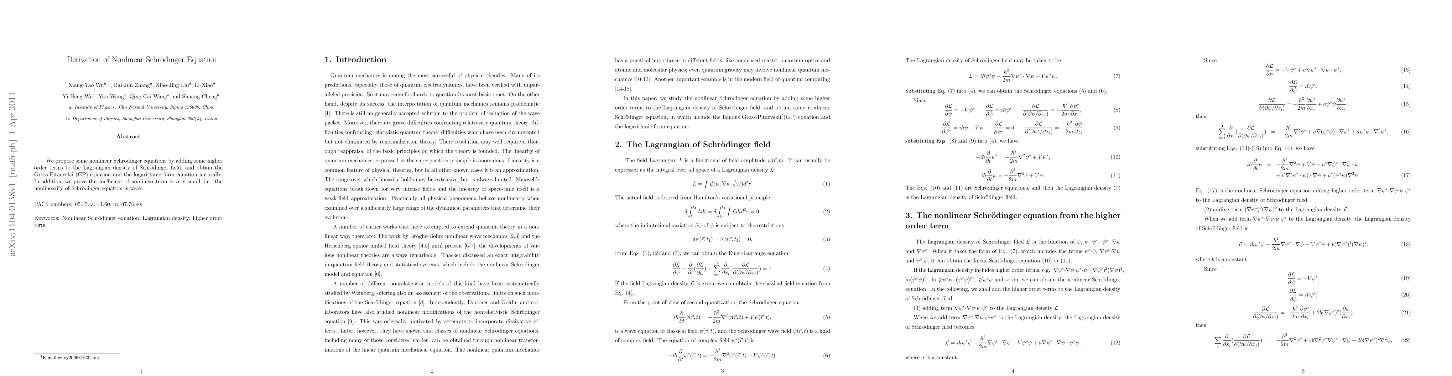 This paper derives various nonlinear Schrödinger equations by introducing higher-order terms into the Schrödinger field's Lagrangian density, leading naturally to the Gross-Pitaevskii equation and a logarithmic form equation. It also demonstrates that the coefficient of the nonlinear term is very small, indicating a weak nonlinearity.