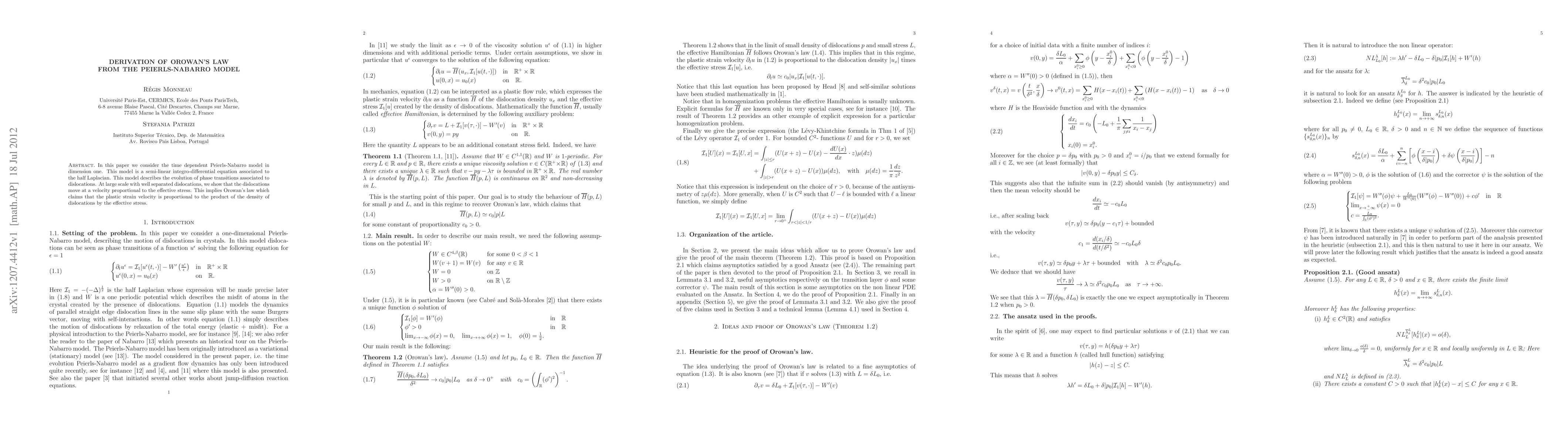 This paper derives Orowan's law from the time-dependent Peierls-Nabarro model, demonstrating that dislocations move at a velocity proportional to the effective stress, thus supporting the relationship between plastic strain velocity and the density of dislocations.