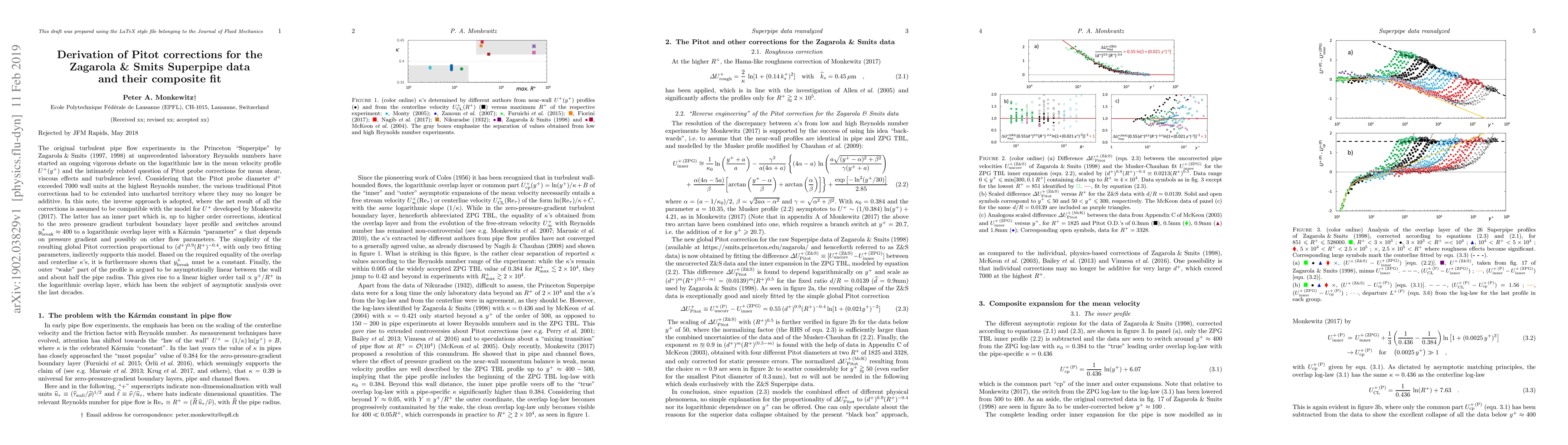 The original turbulent pipe flow experiments in the Princeton "Superpipe" by Zagarola & Smits (1997, 1998) at unprecedented laboratory Reynolds numbers have started an ongoing vigorous debate on the logarithmic law in the mean velocity profile $U^+(y^+)$ and the intimately related question of Pitot probe corrections for mean shear, viscous effects and turbulence level. Considering that the Pitot probe diameter $d^+$ exceeded 7000 wall units at the highest Reynolds number, the various \textcolor{black}{traditional Pitot} corrections had to be extended into uncharted territory \textcolor{black}{where they may no longer be additive}. In this note, the inverse approach is adopted, where the net result of all the corrections is assumed to be compatible with the model for $U^+$ developed by \cite{Monk17}. The latter has an inner part which is, up to higher order corrections, identical to the zero pressure gradient turbulent boundary layer profile and switches around $y^+_{\mathrm{break}} \approx 400$ to a logarithmic overlap layer with a K\'arm\'an "parameter" $\kappa$ \textcolor{black}{that depends on pressure gradient and possibly on other flow parameters}. The simplicity of the resulting global Pitot correction proportional to $(d^+)^{0.9}(R^+)^{-0.4}$, with only two fitting parameters, indirectly supports this model. \textcolor{black}{Based on the required equality of the overlap and centerline $\kappa$'s, it is furthermore shown that $y^+_{\mathrm{break}}$ must be a constant.} \textcolor{black}{Finally,} the outer "wake" part of the profile is argued to be asymptotically linear between the wall and about half the pipe radius. This gives rise to a linear higher order tail $\propto y^+/R^+$ in the logarithmic overlap layer, which has been \textcolor{black}{the subject} of asymptotic analysis over the last decades.