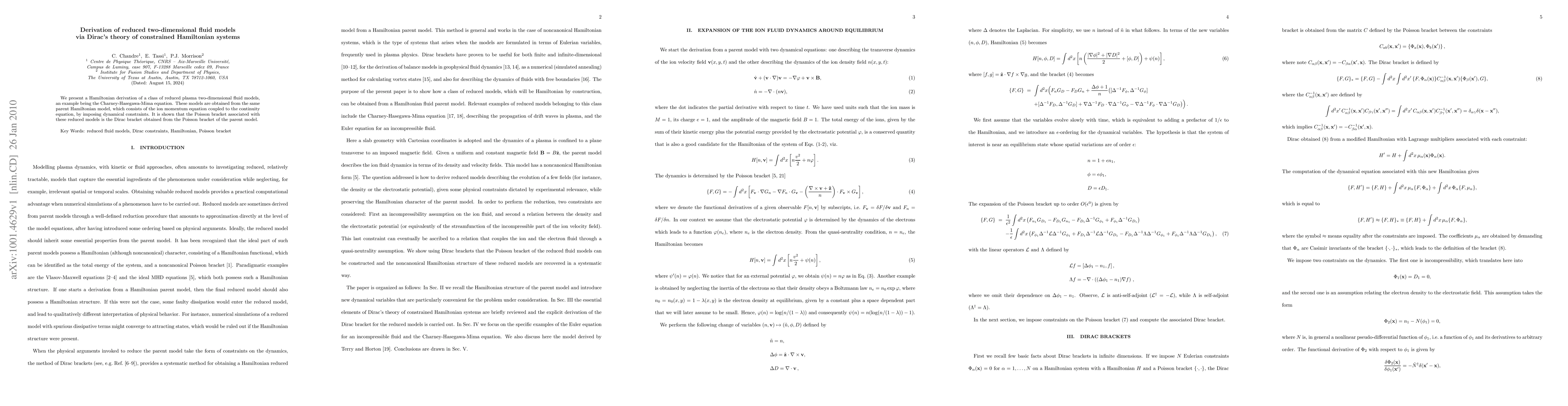 We present a Hamiltonian derivation of a class of reduced plasma two-dimensional fluid models, an example being the Charney-Hasegawa-Mima equation. These models are obtained from the same parent Hamiltonian model, which consists of the ion momentum equation coupled to the continuity equation, by imposing dynamical constraints. It is shown that the Poisson bracket associated with these reduced models is the Dirac bracket obtained from the Poisson bracket of the parent model.