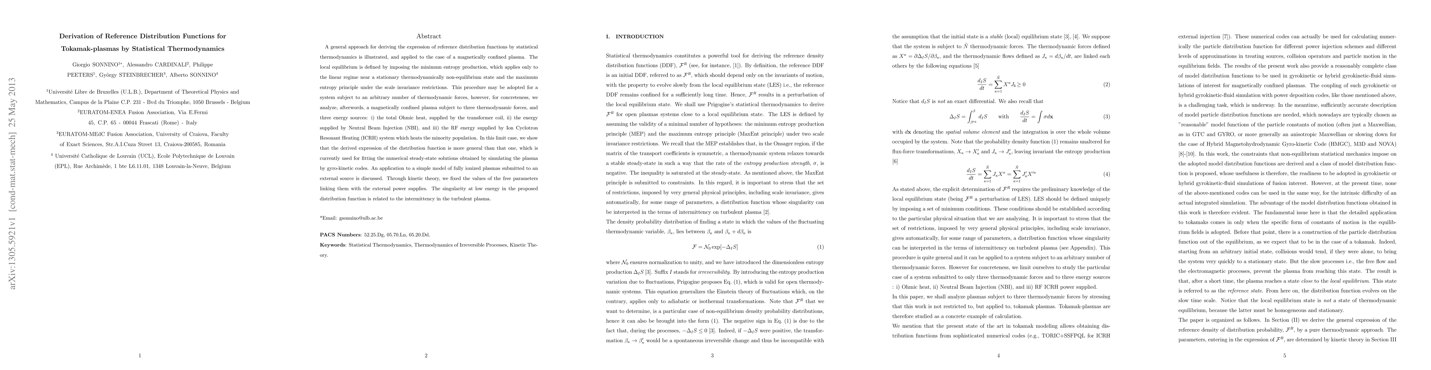 A general approach for deriving the expression of reference distribution functions by statistical thermodynamics is illustrated, and applied to the case of a magnetically confined plasma. The local equilibrium is defined by imposing the minimum entropy production, which applies only to the linear regime near a stationary thermodynamically non-equilibrium state and the maximum entropy principle under the scale invariance restrictions. This procedure may be adopted for a system subject to an arbitrary number of thermodynamic forces, however, for concreteness, we analyze, afterwords, a magnetically confined plasma subject to three thermodynamic forces, and three energy sources: i) the total Ohmic heat, supplied by the transformer coil, ii) the energy supplied by Neutral Beam Injection (NBI), and iii) the RF energy supplied by Ion Cyclotron Resonant Heating (ICRH) system which heats the minority population. In this limit case, we show that the derived expression of the distribution function is more general than that one, which is currently used for fitting the numerical steady-state solutions obtained by simulating the plasma by gyro-kinetic codes. An application to a simple model of fully ionized plasmas submitted to an external source is discussed. Through kinetic theory, we fixed the values of the free parameters linking them with the external power supplies. The singularity at low energy in the proposed distribution function is related to the intermittency in the turbulent plasma.