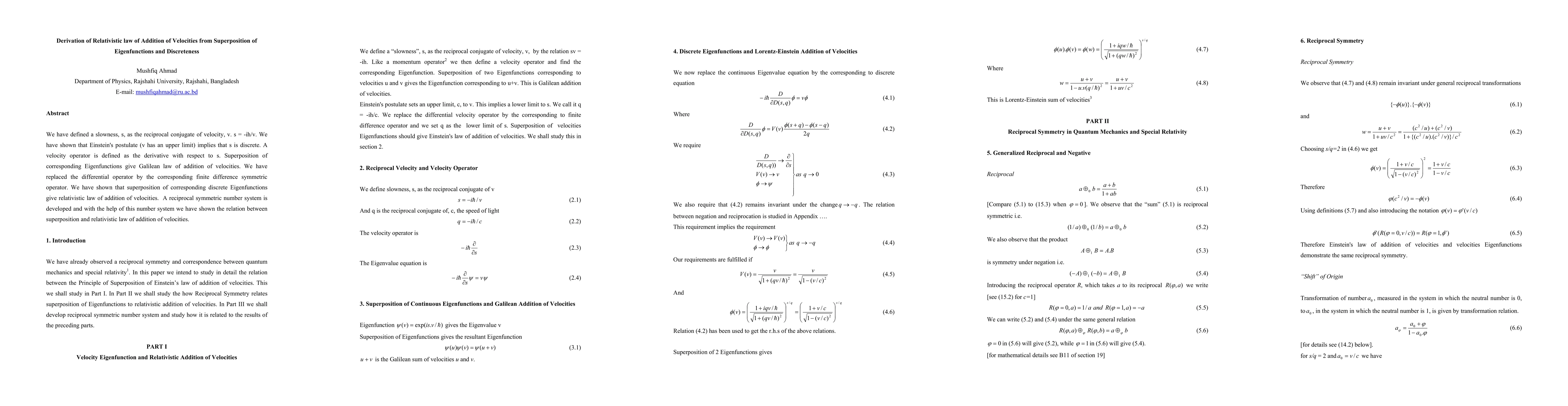 We have defined a slowness, s, as the reciprocal conjugate of velocity, v. s = -ih/v. We have shown that Einstein's postulate (v has an upper limit) implies that s is discrete. A velocity operator is defined as the derivative with respect to s. Superposition of corresponding Eigenfunctions give Galilean law of addition of velocities. We have replaced the differential operator by the corresponding finite difference symmetric operator. We have shown that superposition of corresponding discrete Eigenfunctions give relativistic law of addition of velocities. A reciprocal symmetric number system is developed and with the help of this number system we have shown the relation between superposition and relativistic law of addition of velocities.