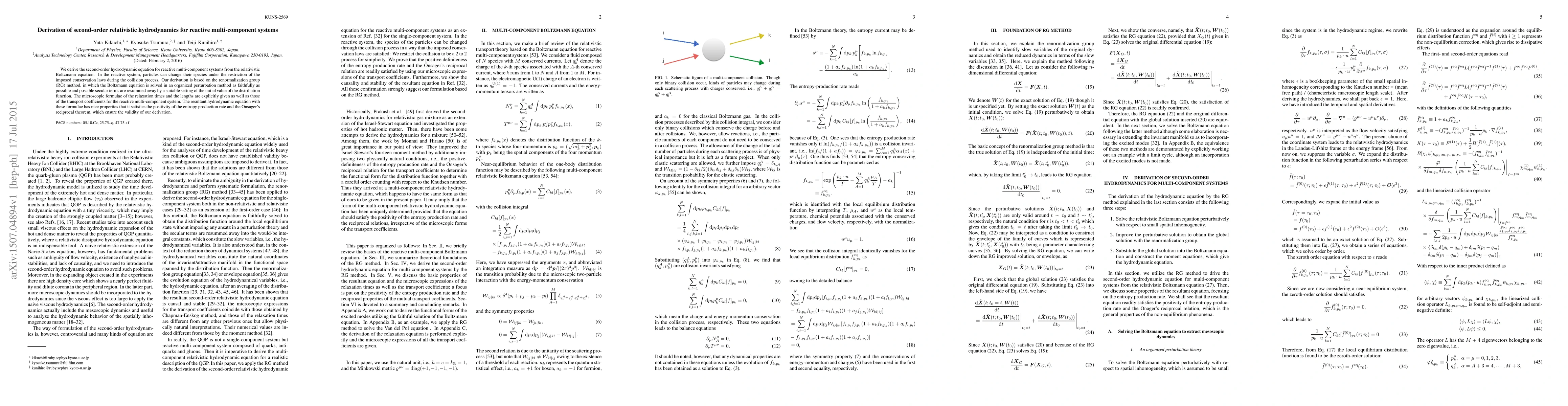 We derive the second-order hydrodynamic equation for reactive multi-component systems from the relativistic Boltzmann equation. In the reactive system, particles can change their species under the restriction of the imposed conservation laws during the collision process. Our derivation is based on the renormalization group (RG) method, in which the Boltzmann equation is solved in an organized perturbation method as faithfully as possible and possible secular terms are resummed away by a suitable setting of the initial value of the distribution function. The microscopic formulae of the relaxation times and the lengths are explicitly given as well as those of the transport coefficients for the reactive multi-component system. The resultant hydrodynamic equation with these formulae has nice properties that it satisfies the positivity of the entropy production rate and the Onsager's reciprocal theorem, which ensure the validity of our derivation.