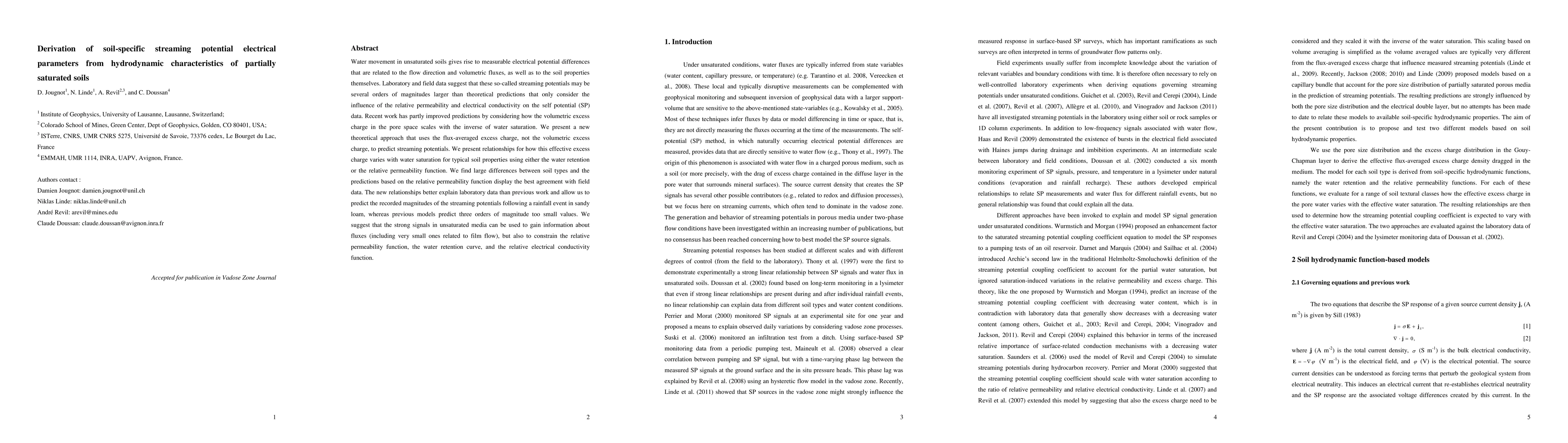 This paper develops a new theoretical model to derive soil-specific streaming potential parameters from hydrodynamic characteristics of partially saturated soils, showing significant improvements over previous models in predicting the magnitudes of streaming potentials following rainfall events. The new approach considers flux-averaged excess charge, providing better agreement with field data and laboratory observations.