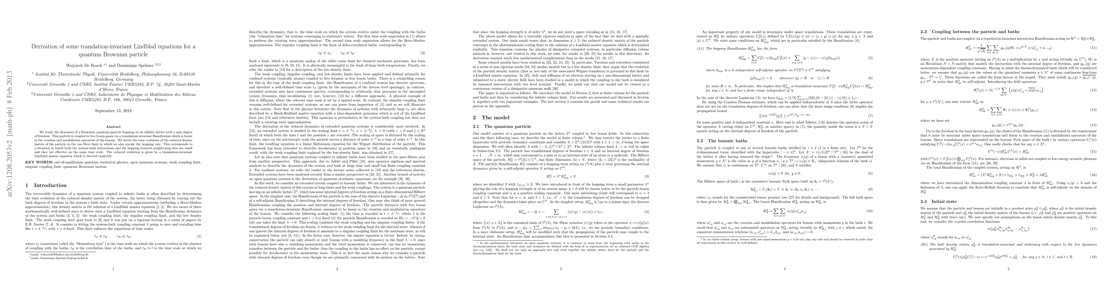 We study the dynamics of a Brownian quantum particle hopping on an infinite lattice with a spin degree of freedom. This particle is coupled to free boson gases via a translation-invariant Hamiltonian which is linear in the creation and annihilation operators of the bosons. We derive the time evolution of the reduced density matrix of the particle in the van Hove limit in which we also rescale the hopping rate. This corresponds to a situation in which both the system-bath interactions and the hopping between neighboring sites are small and they are effective on the same time scale. The reduced evolution is given by a translation-invariant Lindblad master equation which is derived explicitly.