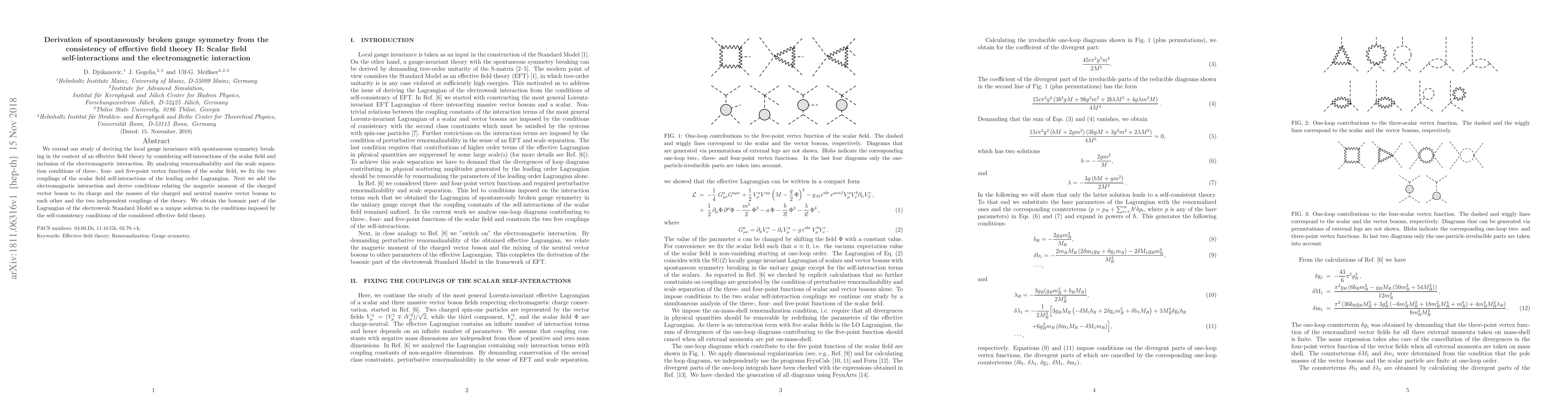 We extend our study of deriving the local gauge invariance with spontaneous symmetry breaking in the context of an effective field theory by considering self-interactions of the scalar field and inclusion of the electromagnetic interaction. By analyzing renormalizability and the scale separation conditions of three-, four- and five-point vertex functions of the scalar field, we fix the two couplings of the scalar field self-interactions of the leading order Lagrangian. Next we add the electromagnetic interaction and derive conditions relating the magnetic moment of the charged vector boson to its charge and the masses of the charged and neutral massive vector bosons to each other and the two independent couplings of the theory. We obtain the bosonic part of the Lagrangian of the electroweak Standard Model as a unique solution to the conditions imposed by the self-consistency conditions of the considered effective field theory.