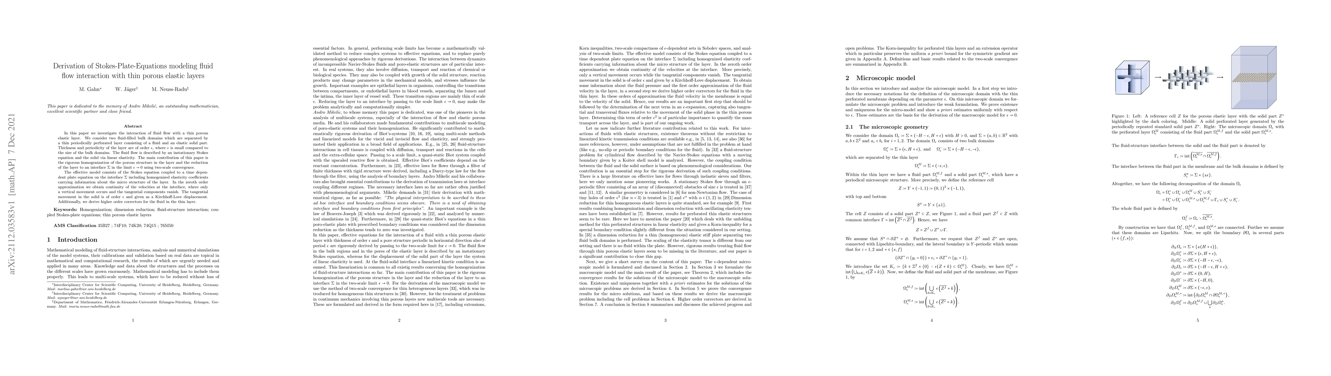 This paper rigorously derives the Stokes-plate equations for fluid flow interacting with a thin porous elastic layer, employing homogenization techniques to reduce the layer to an effective interface model. The effective model includes coupled Stokes equations and a time-dependent plate equation with homogenized elasticity coefficients.