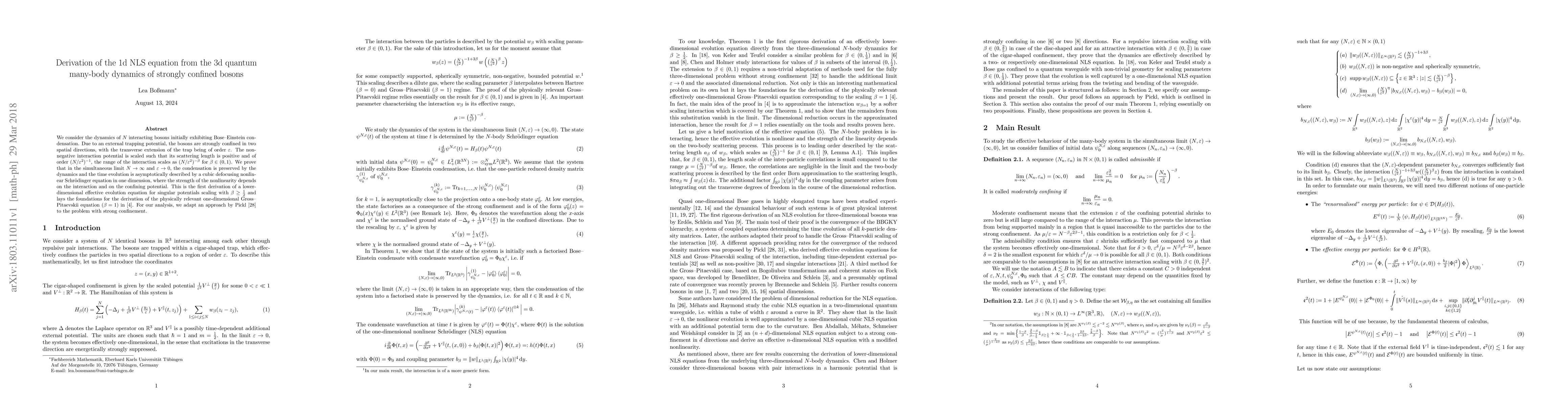 Researchers derive a one-dimensional nonlinear Schr"odinger equation from the three-dimensional dynamics of strongly confined bosons, providing an effective evolution equation for a lower-dimensional system.