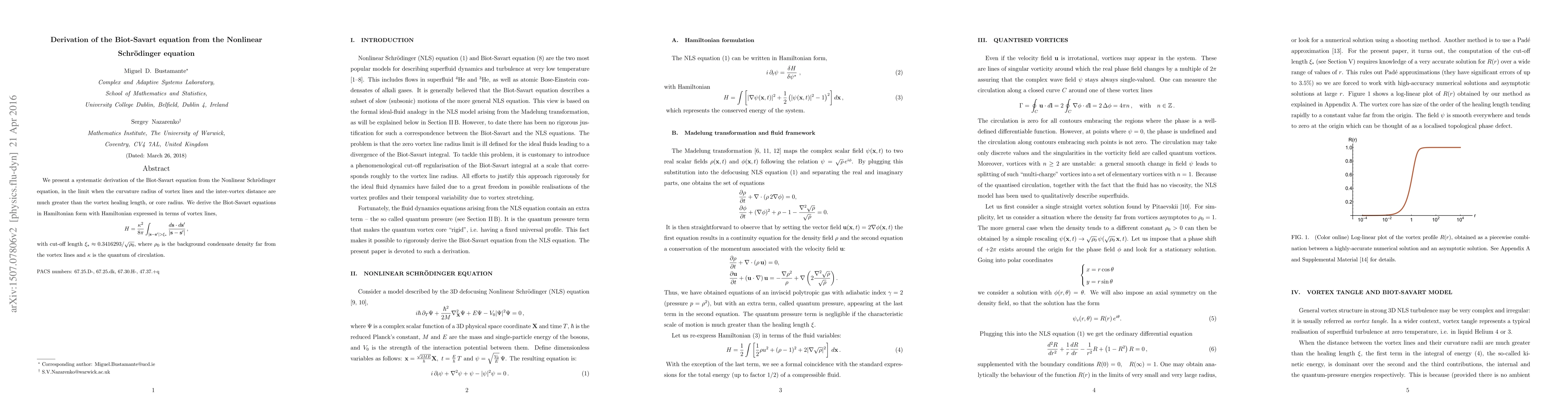 We present a systematic derivation of the Biot-Savart equation from the Nonlinear Schr\"odinger equation, in the limit when the curvature radius of vortex lines and the inter-vortex distance are much greater than the vortex healing length, or core radius. We derive the Biot-Savart equations in Hamiltonian form with Hamiltonian expressed in terms of vortex lines, $$ H= \frac{\kappa^2}{8 \pi}\int_{|{\bf s}-{\bf s}'|>\xi_*} \frac{d{\bf s} \cdot d {\bf s}'}{|{\bf s}-{\bf s}'|} \,,$$ with cut-off length $\xi_* \approx 0.3416293 /\sqrt{\rho_0},$ where $\rho_0$ is the background condensate density far from the vortex lines and $\kappa$ is the quantum of circulation.