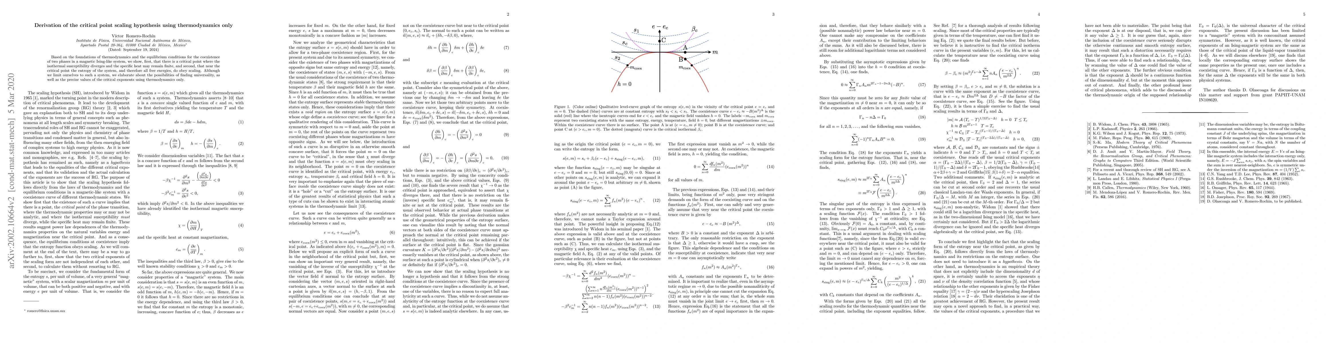 Based on the foundations of thermodynamics and the equilibrium conditions for the coexistence of two phases in a magnetic Ising-like system, we show, first, that there is a critical point where the isothermal susceptibility diverges and the specific heat may remain finite, and second, that near the critical point the entropy of the system, and therefore all free energies, do obey scaling. Although we limit ourselves to such a system, we elaborate about the possibilities of finding universality, as well as the precise values of the critical exponents using thermodynamics only.