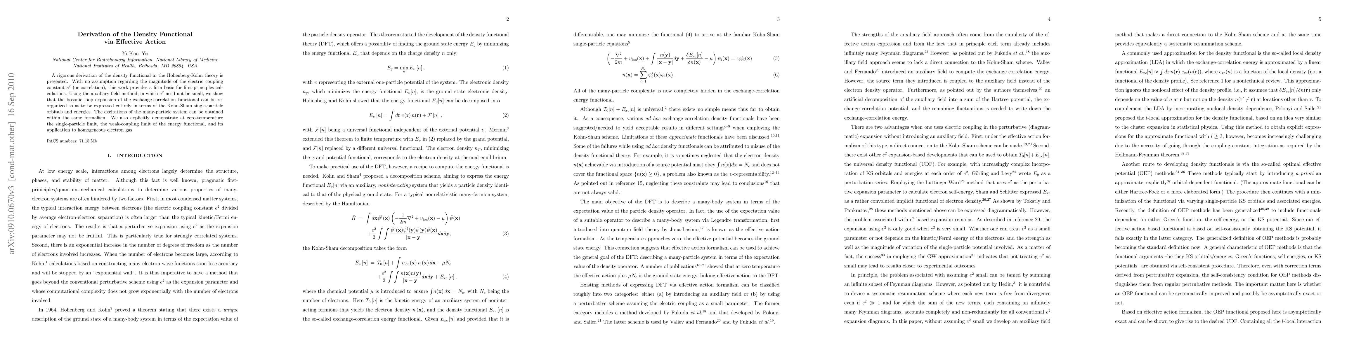 A rigorous derivation of the density functional in the Hohenberg-Kohn theory is presented. With no assumption regarding the magnitude of the electric coupling constant $e^2$ (or correlation), this work provides a firm basis for first-principles calculations. Using the auxiliary field method, in which $e^2$ need not be small, we show that the bosonic loop expansion of the exchange-correlation functional can be reorganized so as to be expressed entirely in terms of the Kohn-Sham single-particle orbitals and energies. The excitations of the many-particle system can be obtained within the same formalism. We also explicitly demonstrate at zero-temperature the single-particle limit, the weak-coupling limit of the energy functional, and its application to homogeneous electron gas.