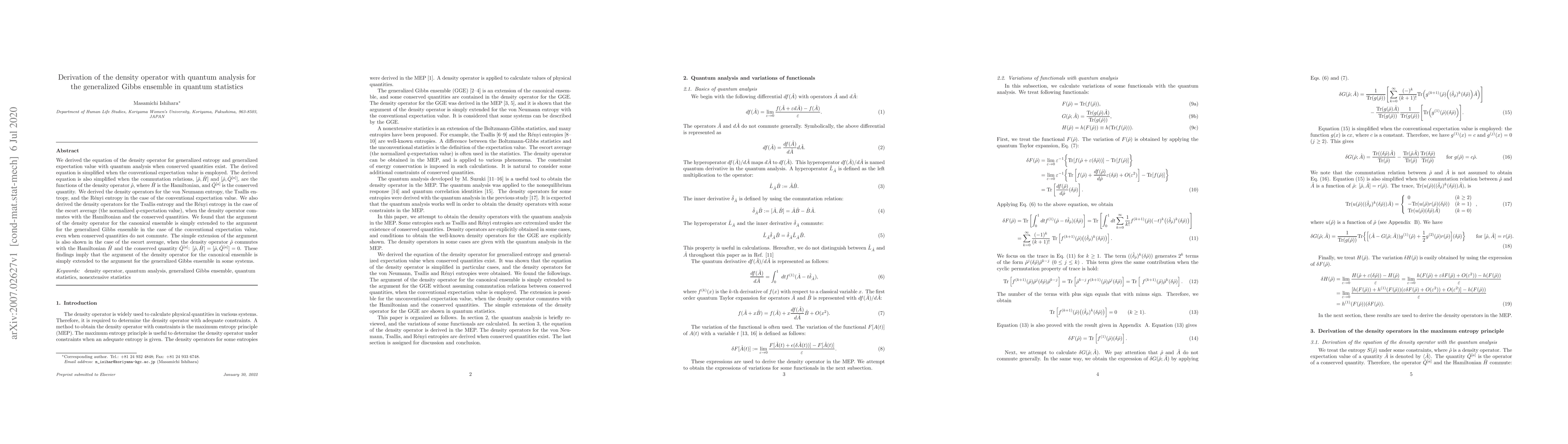 This paper derives the density operator for generalized entropy and expectation values in quantum statistics, particularly for the generalized Gibbs ensemble. It simplifies the equation when conventional expectation values and commutation relations are used, and extends the canonical ensemble's argument to the generalized Gibbs ensemble under certain conditions.