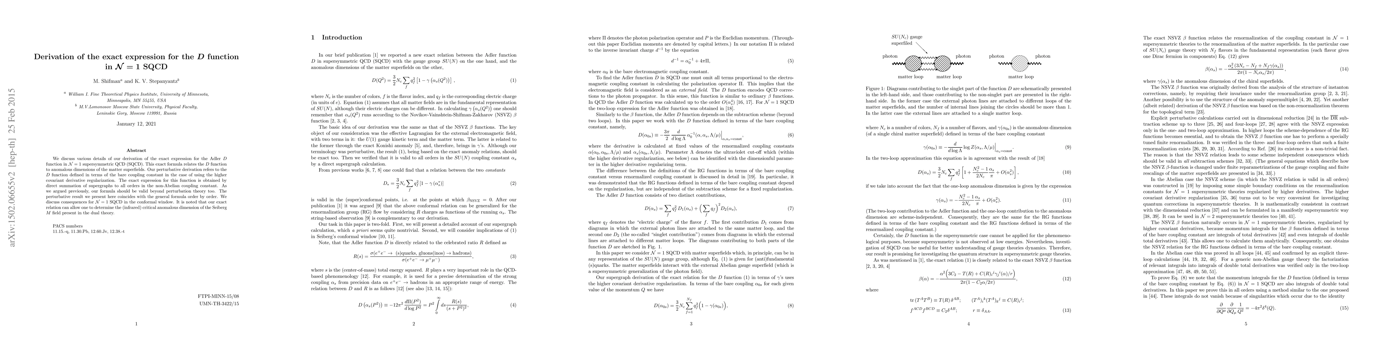 We discuss various details of our derivation of the exact expression for the Adler D function in N=1 supersymmetric QCD (SQCD). This exact formula relates the D function to anomalous dimensions of the matter superfields. Our perturbative derivation refers to the D function defined in terms of the bare coupling constant in the case of using the higher covariant derivative regularization. The exact expression for this function is obtained by direct summation of supergraphs to all orders in the non-Abelian coupling constant. As we argued previously, our formula should be valid beyond perturbation theory too. The perturbative result we present here coincides with the general formula order by order. We discuss consequences for N=1 SQCD in the conformal window. It is noted that our exact relation can allow one to determine the (infrared) critical anomalous dimension of the Seiberg M field present in the dual theory.