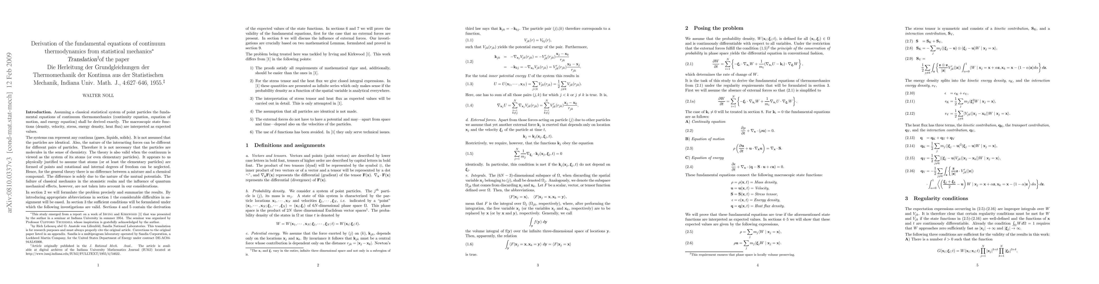 This paper derives the fundamental equations of continuum thermomechanics—continuity, motion, and energy equations—from classical statistical mechanics, interpreting macroscopic state functions as expected values from a system of point particles. The derivation provides a rigorous link between microscopic particle behavior and macroscopic thermodynamic laws.