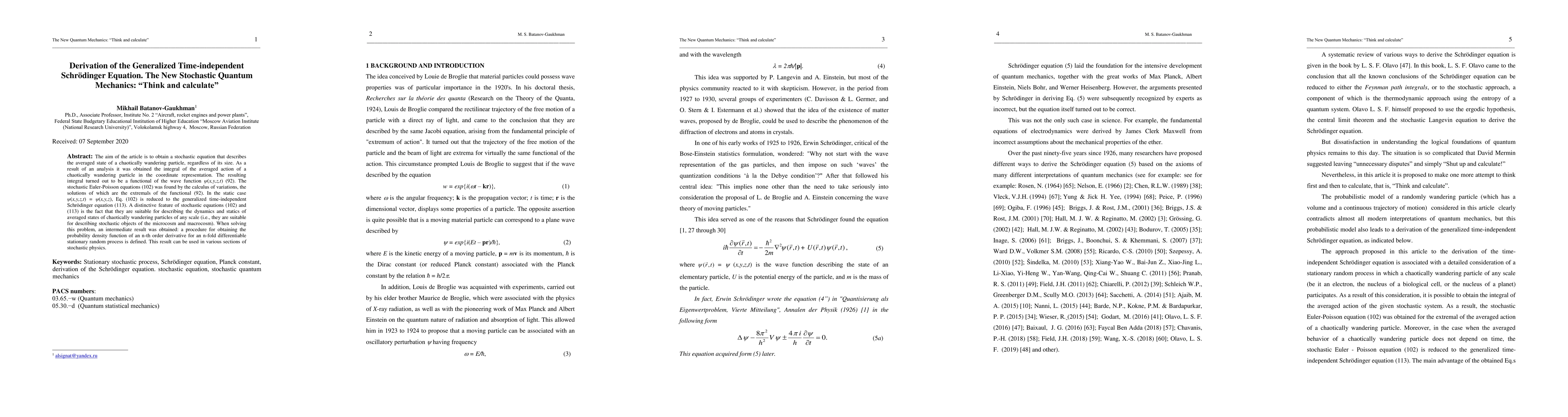 Researchers derived a generalized time-independent Schrodinger equation using stochastic quantum mechanics, showing its applicability to both microcosm objects and macroscopic systems.