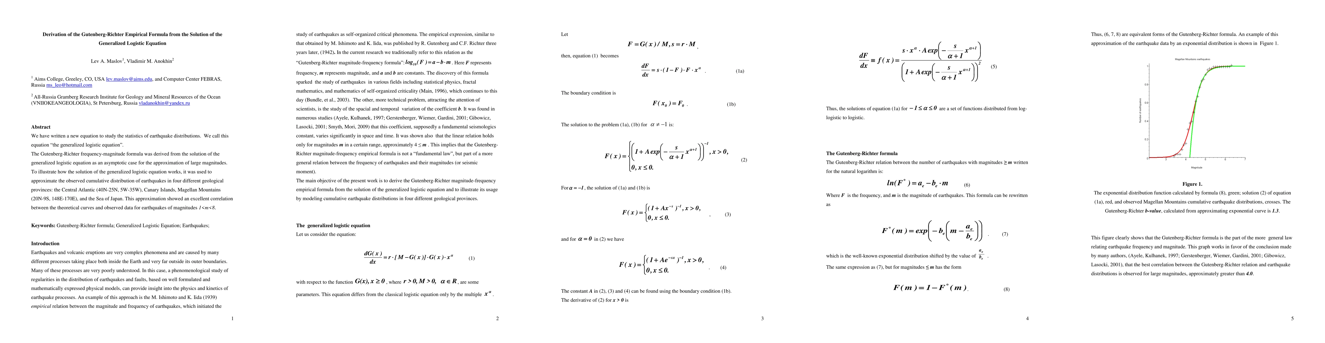 The paper derives the Gutenberg-Richter formula from the solution of a new generalized logistic equation, demonstrating its applicability through a good fit to observed earthquake distributions in four geological regions. This derivation shows the formula's relevance in approximating large magnitude earthquakes.