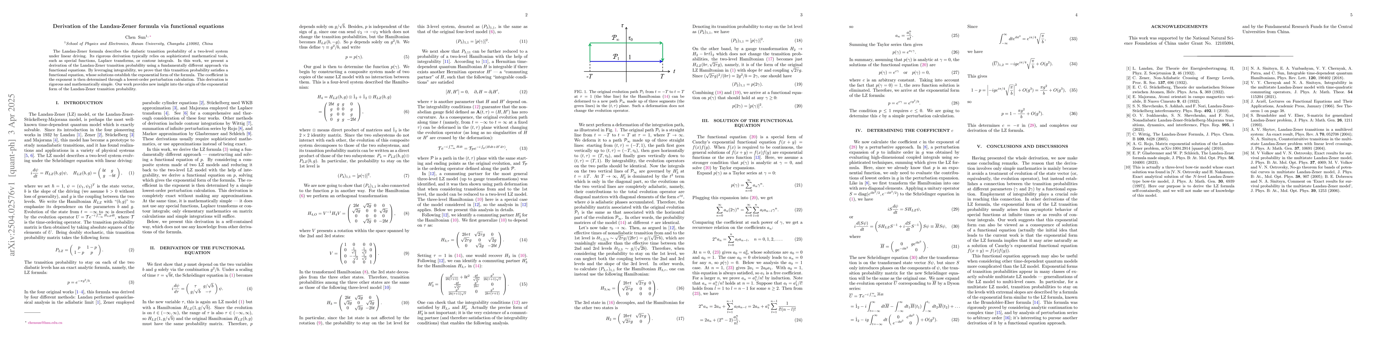 The paper presents a derivation of the Landau-Zener transition probability using functional equations, leveraging integrability to prove that the transition probability satisfies a functional equation. The coefficient in the exponent is then determined through a lowest-order perturbation calculation.