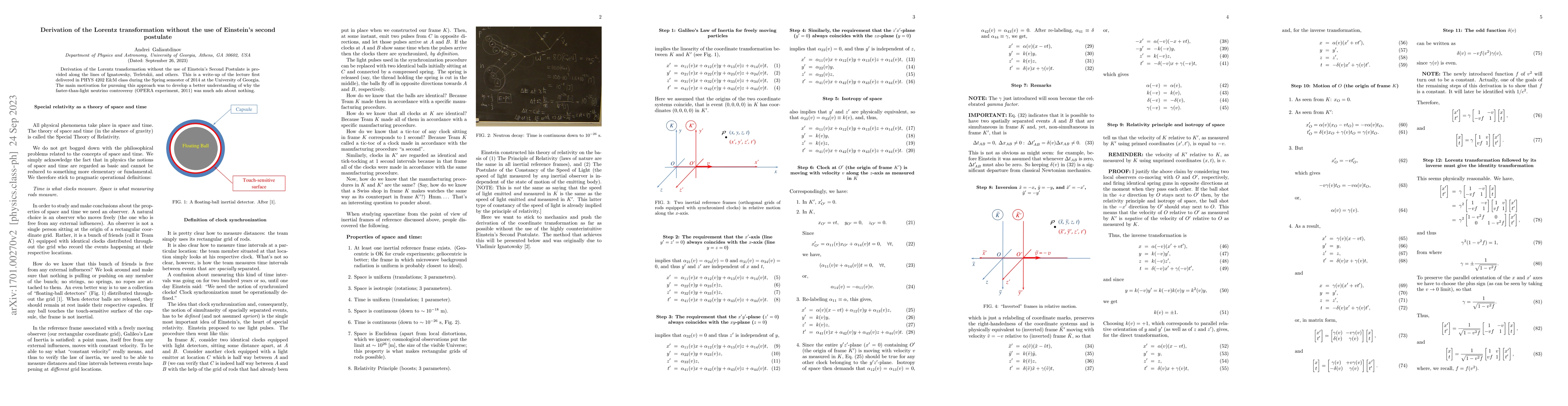 This paper derives the Lorentz transformation using methods akin to Ignatowsky and Terletskii, bypassing Einstein's Second Postulate. The approach aims to clarify the misconceptions surrounding the faster-than-light neutrino claims from the OPERA experiment.