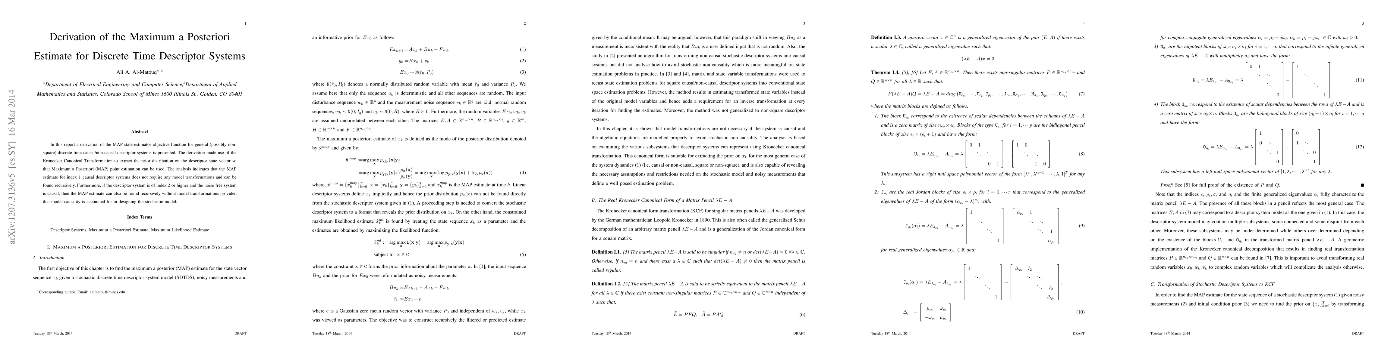 In this report a derivation of the MAP state estimator objective function for general (possibly non-square) discrete time causal/non-causal descriptor systems is presented. The derivation made use of the Kronecker Canonical Transformation to extract the prior distribution on the descriptor state vector so that Maximum a Posteriori (MAP) point estimation can be used. The analysis indicates that the MAP estimate for index 1 causal descriptor systems does not require any model transformations and can be found recursively. Furthermore, if the descriptor system is of index 2 or higher and the noise free system is causal, then the MAP estimate can also be found recursively without model transformations provided that model causality is accounted for in designing the stochastic model.