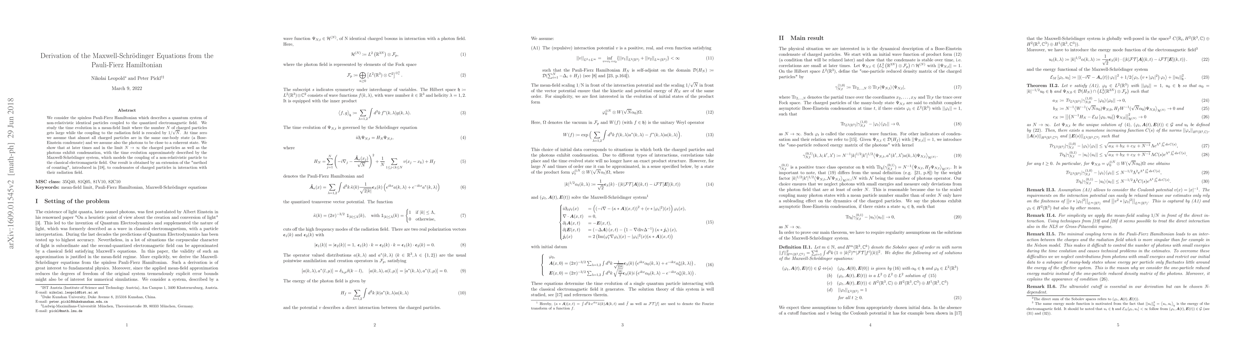 This paper derives the Maxwell-Schrödinger equations from the Pauli-Fierz Hamiltonian in a mean-field limit, showing that large numbers of charged particles coupled to a quantized electromagnetic field evolve towards a state described by this system, with both particles and photons undergoing condensation. The method extends the "method of counting" to analyze condensates.
