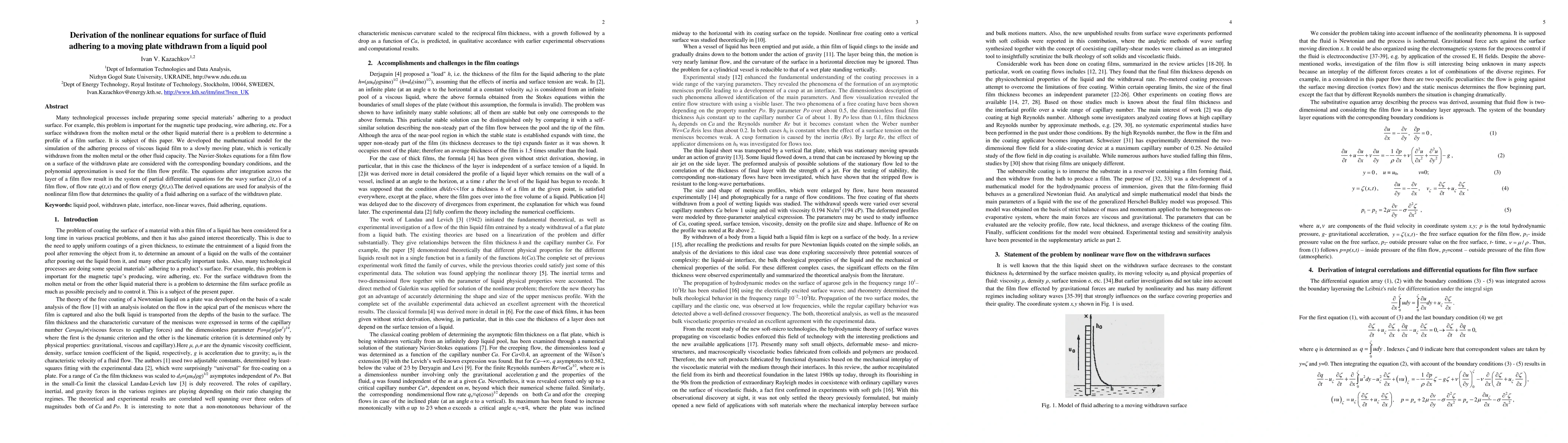 Many technological processes include preparing some special materials adhering to a product surface. For example, this problem is important for the magnetic tape producing, wire adhering, etc. For a surface withdrawn from the molten metal or the other liquid material there is a problem to determine a profile of a film surface. It is subject of this paper. We developed the mathematical model for the simulation of the adhering process of viscous liquid film to a slowly moving plate, which is vertically withdrawn from the molten metal or the other fluid capacity. The Navier-Stokes equations for a film flow on a surface of the withdrawn plate are considered with the corresponding boundary conditions, and the polynomial approximation is used for the film flow profile. The equations after integration across the layer of a film flow result in the system of partial differential equations for the wavy surface of a film flow, of flow rate and of flow energy.The derived equations are used for analysis of the nonlinear film flow that determines the quality of a fluid adhering on a surface of the withdrawn plate.