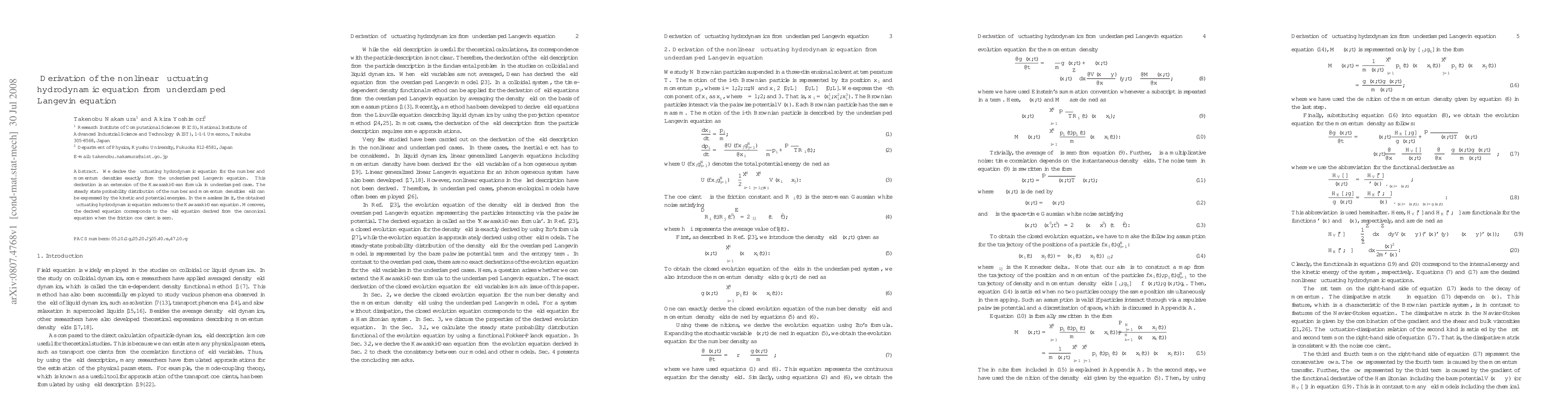 This paper derives the fluctuating hydrodynamic equation for number and momentum densities from the underdamped Langevin equation, extending the Kawasaki-Dean formula. The steady state probability distribution relates kinetic and potential energies, and the massless limit reverts to the Kawasaki-Dean equation.
