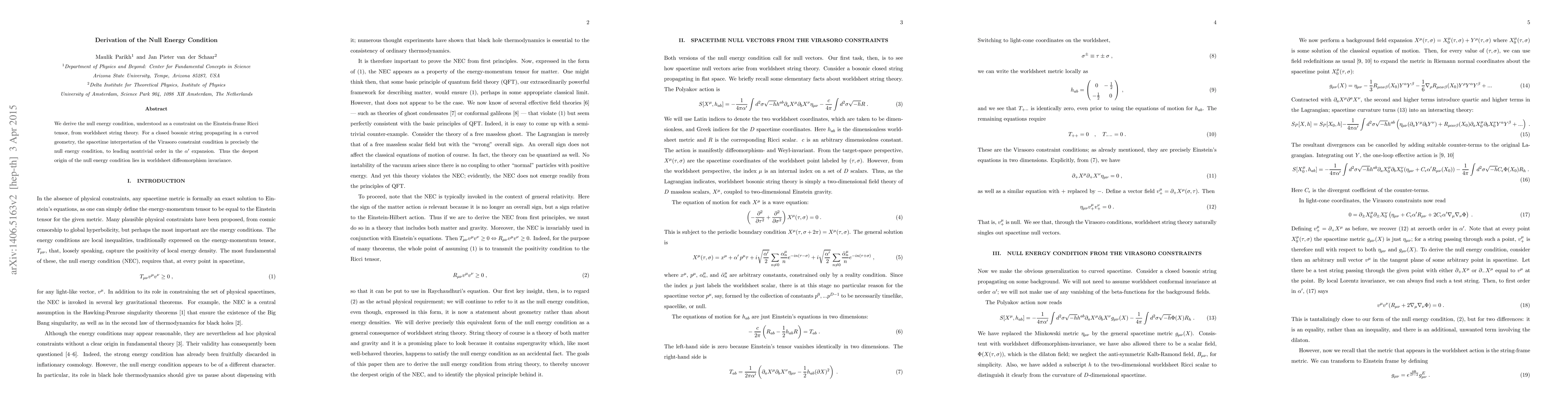 The paper derives the null energy condition from worldsheet string theory, showing that it arises from the spacetime interpretation of the Virasoro constraint for a closed bosonic string in curved geometry, rooted in worldsheet diffeomorphism invariance.