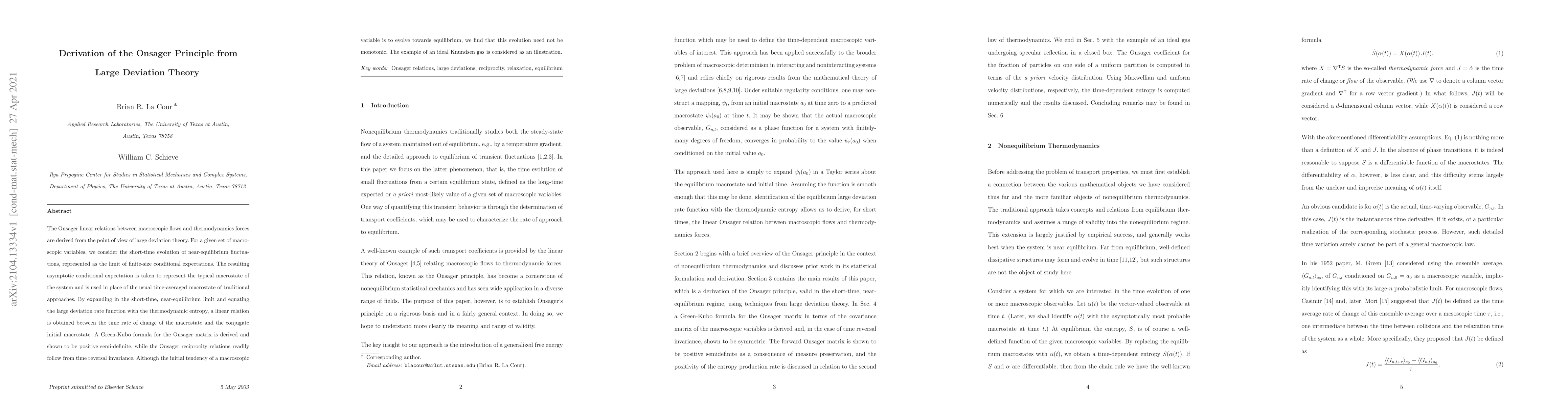 Researchers derived the Onsager Principle from large deviation theory, showing that macroscopic flows and thermodynamic forces have a linear relationship, and this principle can be represented as a positive semi-definite matrix.