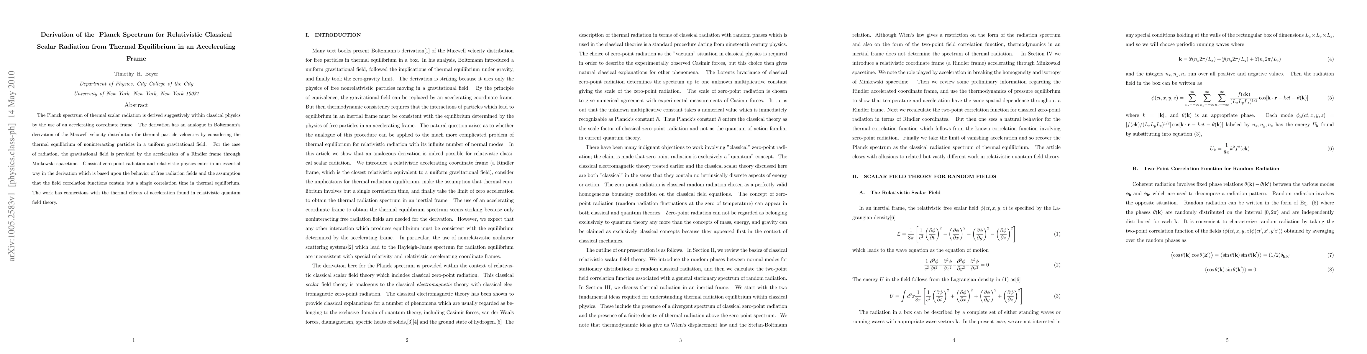 This paper derives the Planck spectrum for relativistic classical scalar radiation using an accelerating frame, analogous to Boltzmann's derivation of the Maxwell velocity distribution. It connects classical zero-point radiation and relativistic physics to show how thermal equilibrium in an accelerating Rindler frame leads to the Planck spectrum.