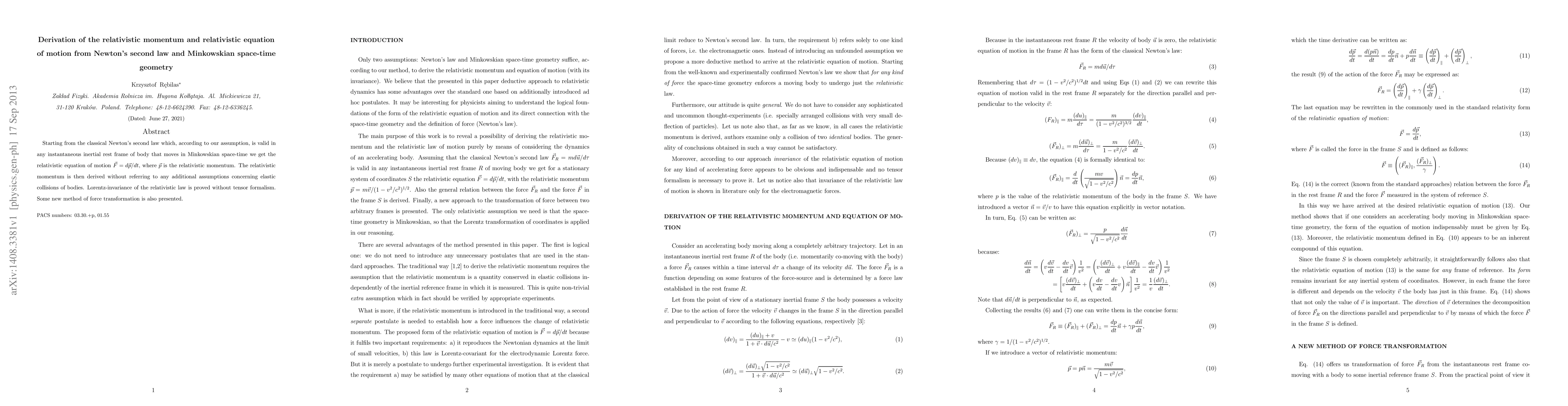 Starting from the classical Newton's second law which, according to our assumption, is valid in any instantaneous inertial rest frame of body that moves in Minkowskian space-time we get the relativistic equation of motion $\vec{F}=d\vec{p}/dt$, where $\vec{p}$ is the relativistic momentum. The relativistic momentum is then derived without referring to any additional assumptions concerning elastic collisions of bodies. Lorentz-invariance of the relativistic law is proved without tensor formalism. Some new method of force transformation is also presented.