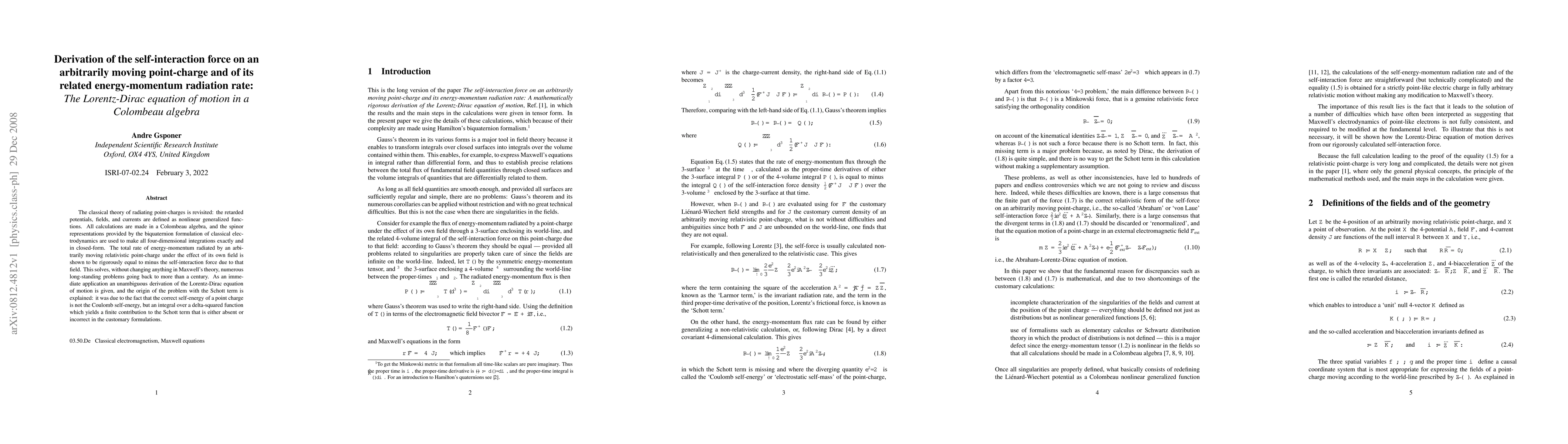 The classical theory of radiating point-charges is revisited: the retarded potentials, fields, and currents are defined as nonlinear generalized functions. All calculations are made in a Colombeau algebra, and the spinor representations provided by the biquaternion formulation of classical electrodynamics are used to make all four-dimensional integrations exactly and in closed-form. The total rate of energy-momentum radiated by an arbitrarily moving relativistic point-charge under the effect of its own field is shown to be rigorously equal to minus the self-interaction force due to that field. This solves, without changing anything in Maxwell's theory, numerous long-standing problems going back to more than a century. As an immediate application an unambiguous derivation of the Lorentz-Dirac equation of motion is given, and the origin of the problem with the Schott term is explained: it was due to the fact that the correct self-energy of a point charge is not the Coulomb self-energy, but an integral over a delta-squared function which yields a finite contribution to the Schott term that is either absent or incorrect in the customary formulations.