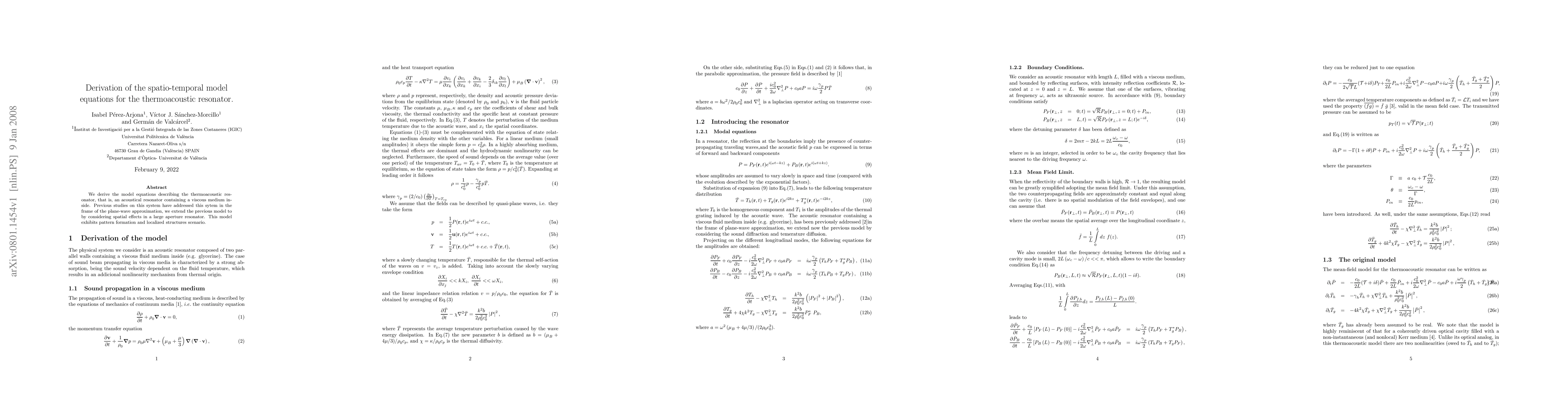 We derive the model equations describing the thermoacoustic resonator, that is, an acoustical resonator containing a viscous medium inside. Previous studies on this system have addressed this sytem in the frame of the plane-wave approximation, we extend the previous model to by considering spatial effects in a large aperture resonator. This model exhibits pattern formation and localized structures scenario.