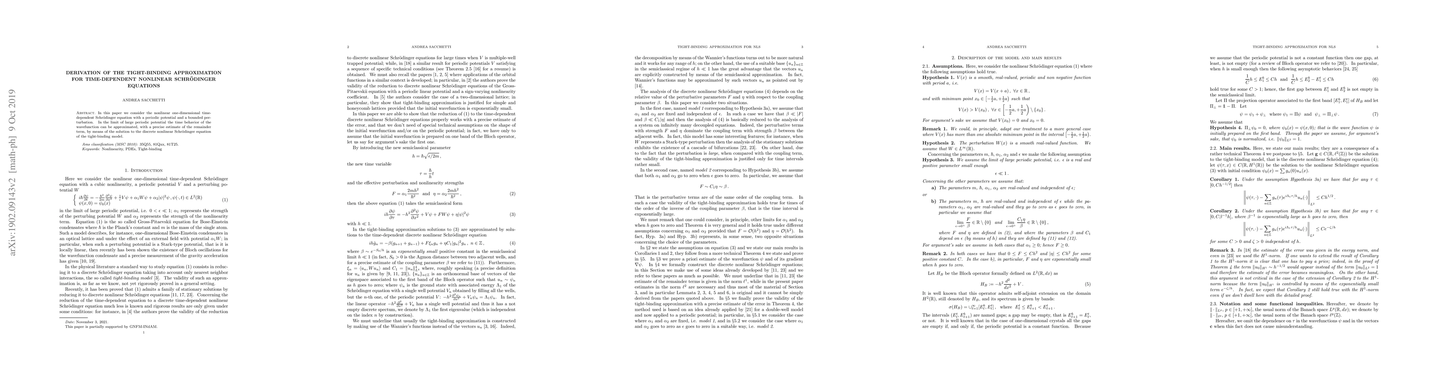 This paper derives the tight-binding approximation for the nonlinear one-dimensional time-dependent Schrödinger equation under a periodic potential and local perturbation, providing an accurate estimate of the remainder term in the approximation.