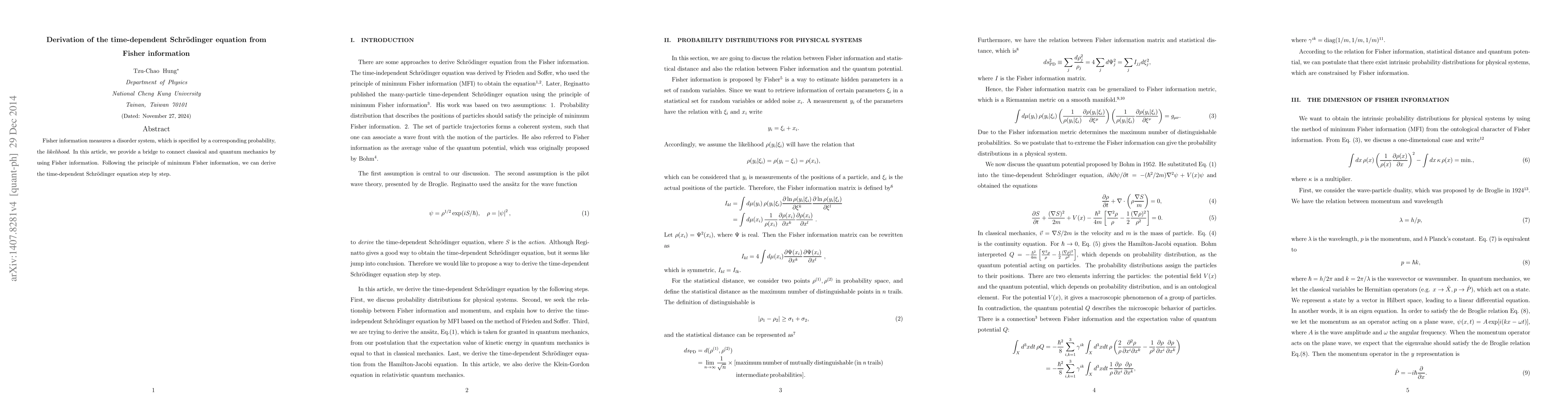 This paper derives the time-dependent Schrödinger equation using Fisher information, which measures disorder in a system, to bridge classical and quantum mechanics. By applying the principle of minimum Fisher information, the authors systematically derive the Schrödinger equation.