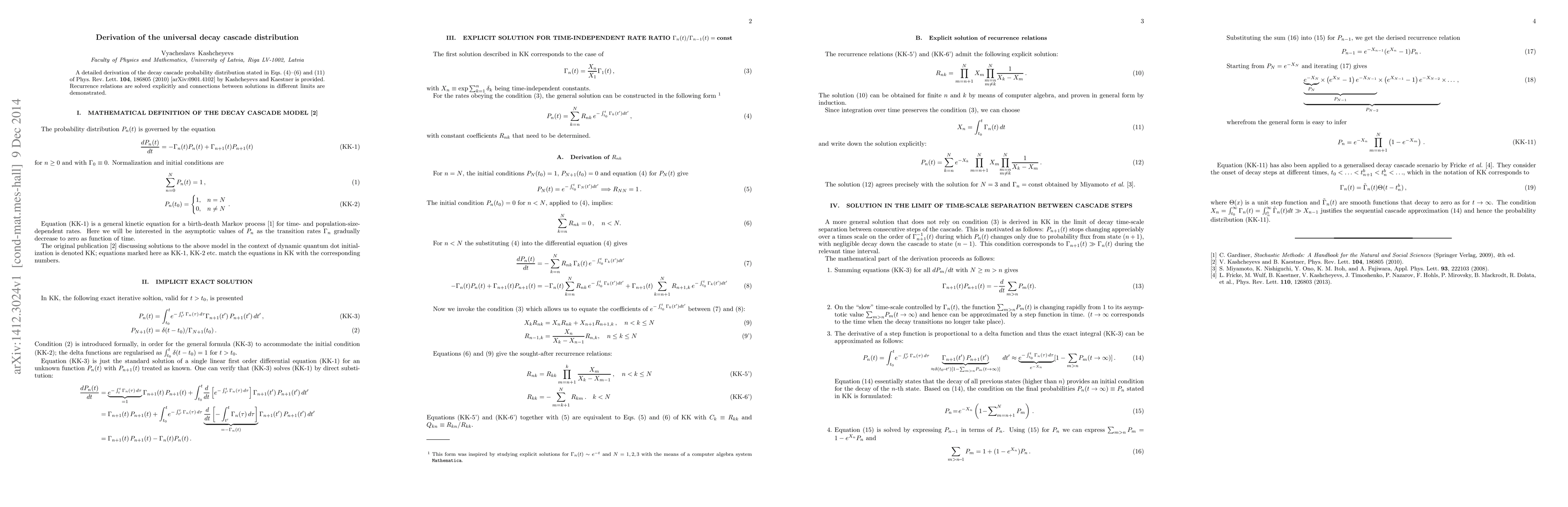 This paper offers a comprehensive derivation of the decay cascade distribution, solving recurrence relations explicitly and revealing links between solutions in various limits, building upon the work of Kashcheyevs and Kaestner as referenced in Phys. Rev. Lett. 104, 186805 (2010) [arXiv:0901.4102].