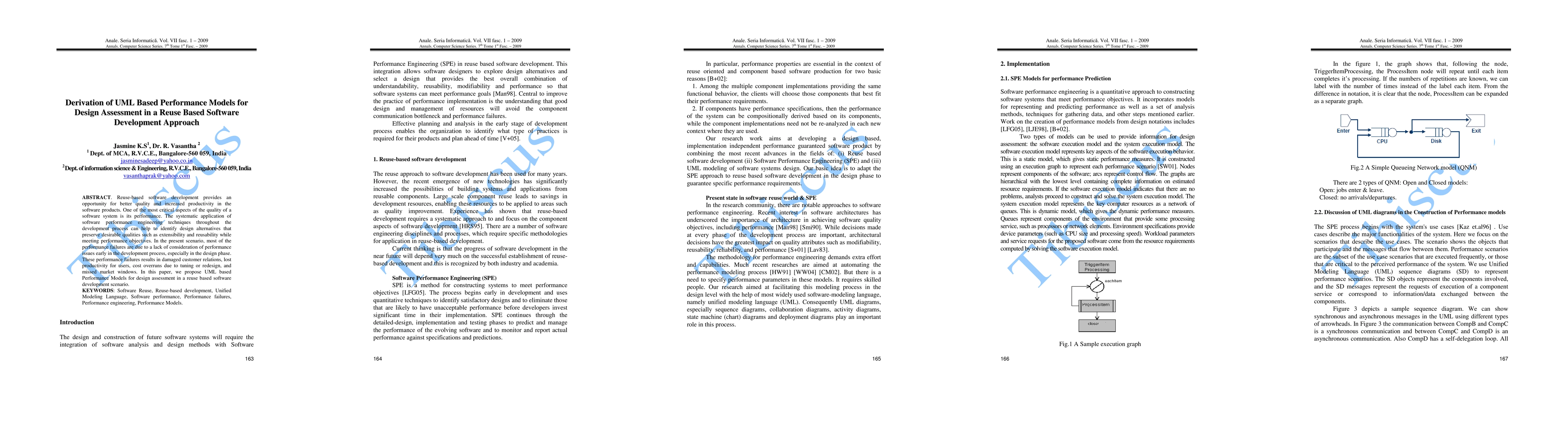 Reuse-based software development provides an opportunity for better quality and increased productivity in the software products. One of the most critical aspects of the quality of a software system is its performance. The systematic application of software performance engineering techniques throughout the development process can help to identify design alternatives that preserve desirable qualities such as extensibility and reusability while meeting performance objectives. In the present scenario, most of the performance failures are due to a lack of consideration of performance issues early in the development process, especially in the design phase. These performance failures results in damaged customer relations, lost productivity for users, cost overruns due to tuning or redesign, and missed market windows. In this paper, we propose UML based Performance Models for design assessment in a reuse based software development scenario.